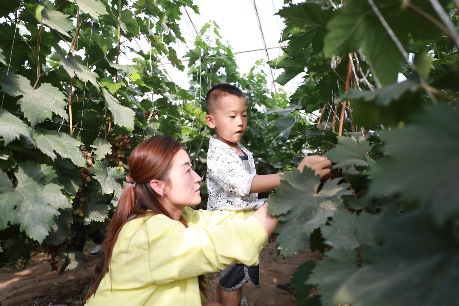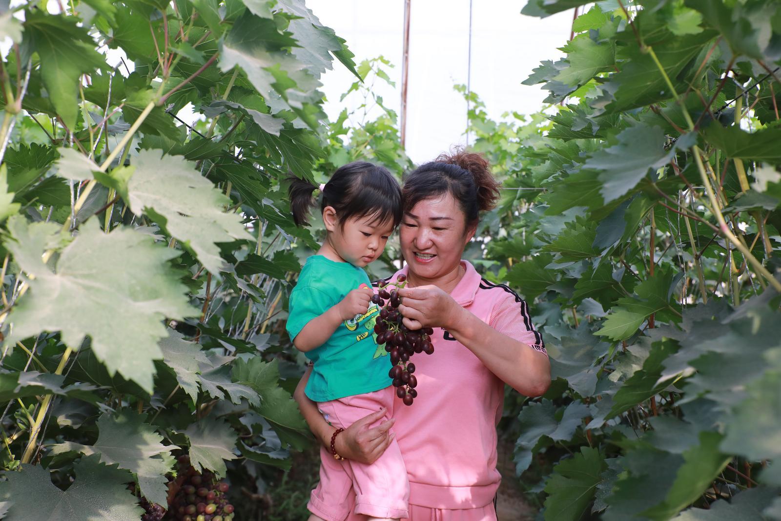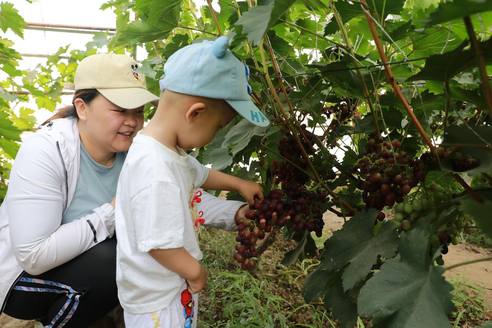 走进葡萄大棚,碧叶叠嶂,果香满园。在充足的日照和农户的悉心养护下,一串串沉甸甸、颗粒饱满的葡萄挂满树藤。成排的葡萄架前,游客迫不及待地摘下一颗熟透的葡萄,顾不上清洗就送入口中,在品尝到鲜甜可口、果味浓郁后,纷纷拿起剪子、拎着小筐,尽情地体验采摘乐趣。