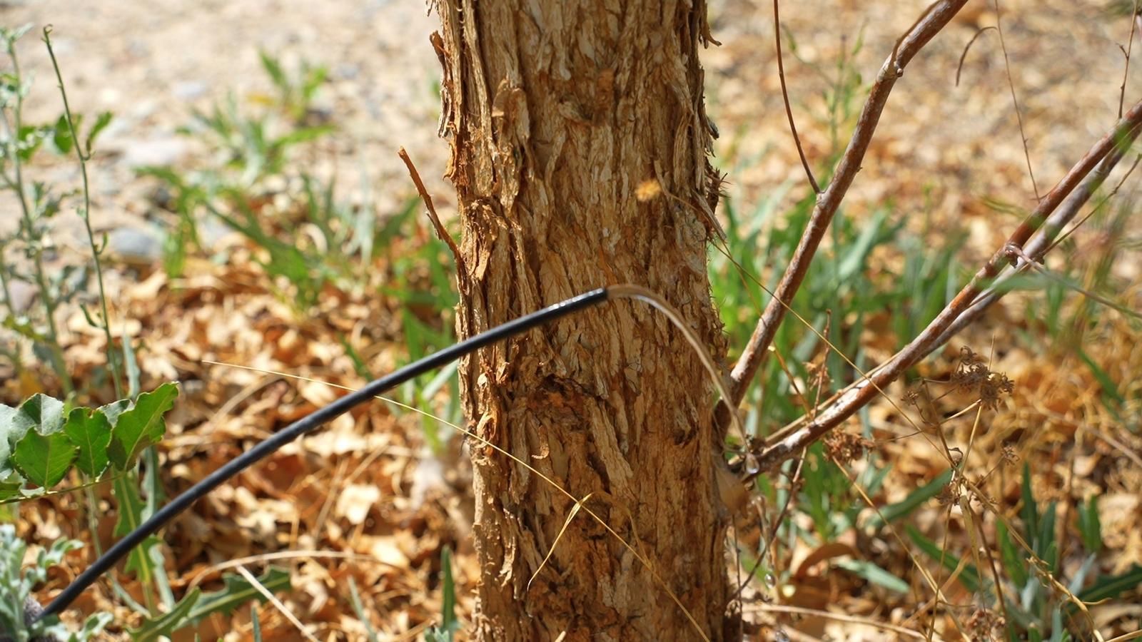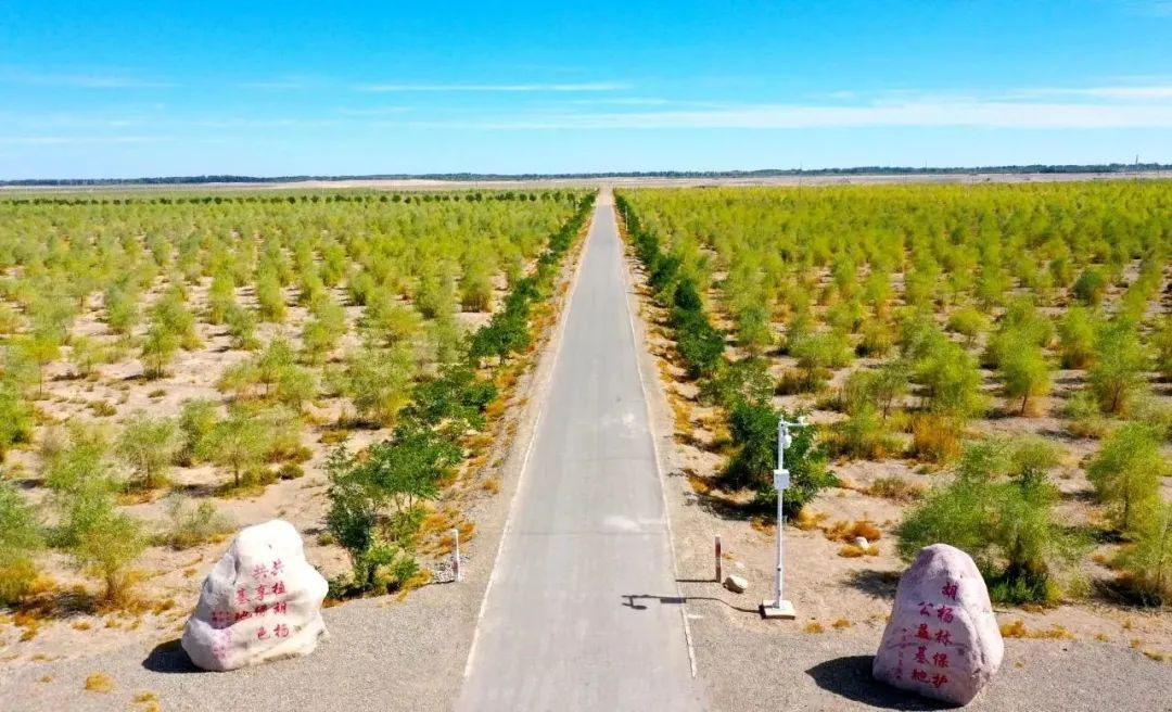眼下,正是防护林苗木管护的关键时期。在金塔县城西防护林,一排排胡杨树挺拔地矗立着。为了保证植物生长,又减少水资源消耗,这里采用了滴灌造林的手段。在胡杨林树间,铺满了黑色的输水管网,将水分从主管道引出,通过“毛细血管”精准、均匀地输送到树木根部。