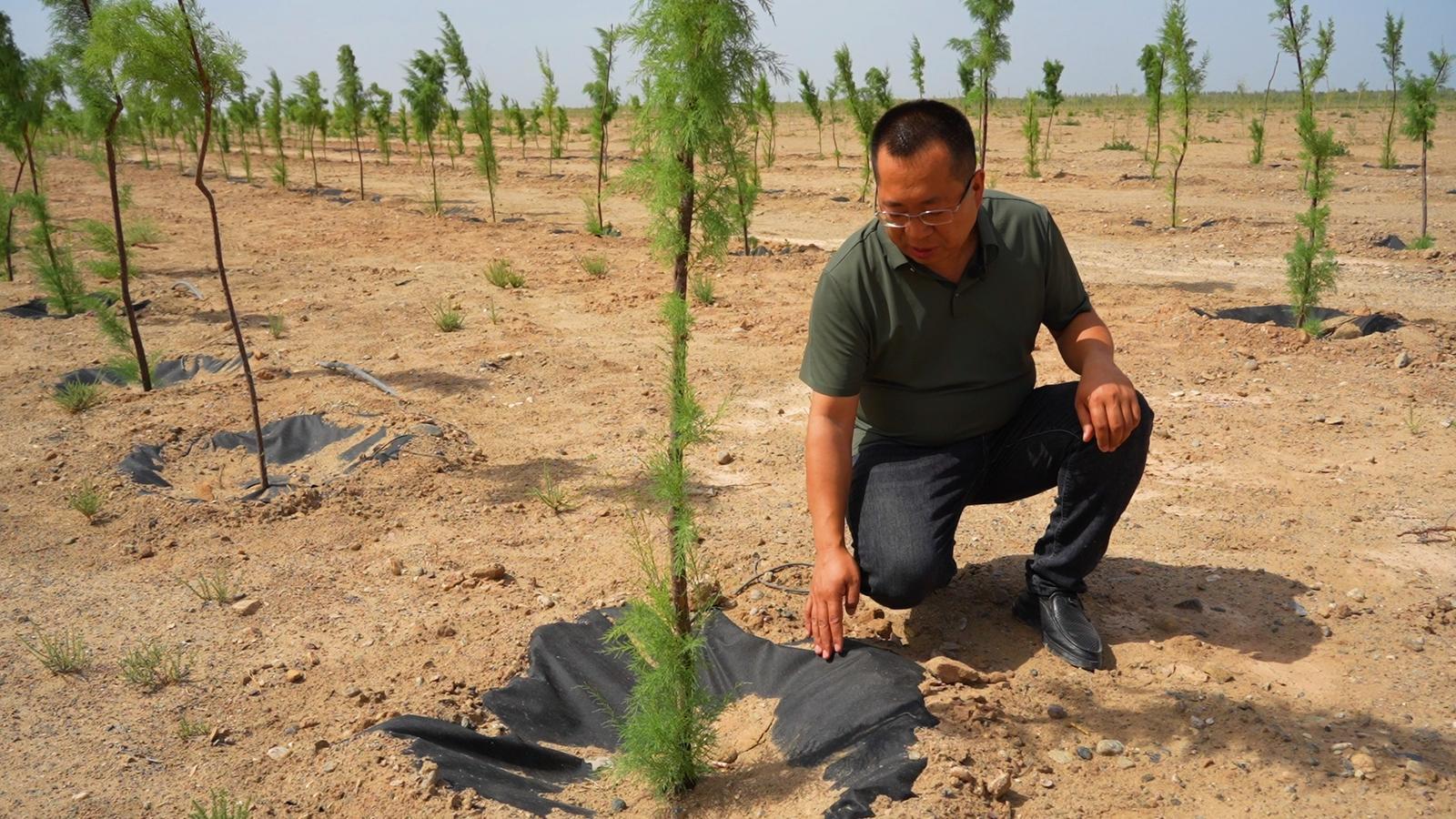 “今年在造林中,我们采用了一种新技术——用无纺布覆盖树穴,这样做的主要目的就是减少水分的蒸发,提高苗木成活率。”金塔县自然资源局国土空间生态修复股股长雷建生说。