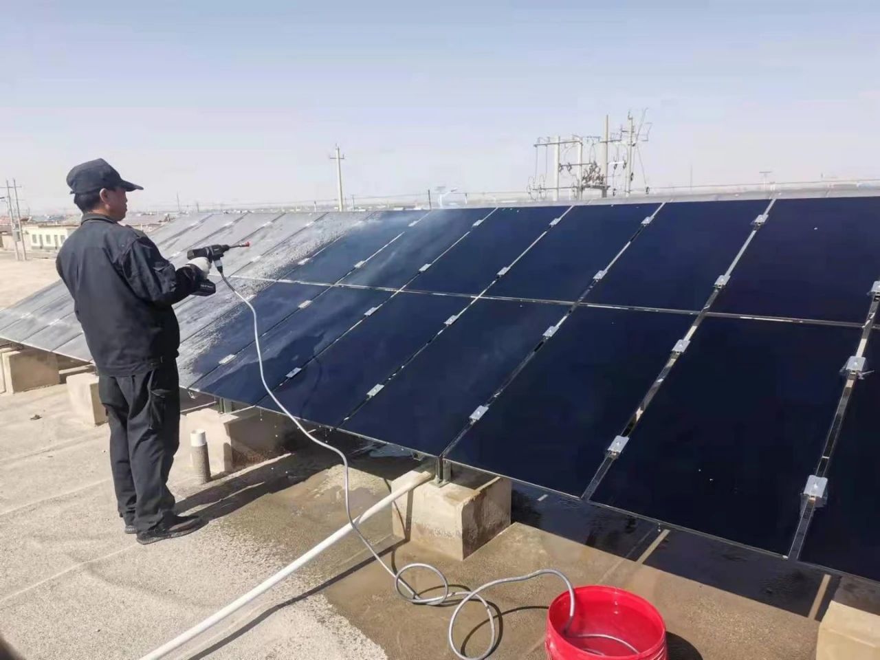 乘着早晨天气不太热,瓜州县广至藏族乡新堡村村民孙随善早早就爬上屋顶开始清洗光伏板。前段时间刮风又下雨,光伏板落满了灰尘,他告诉记者想要自家的光伏电站高效发电,日常运维少不了。