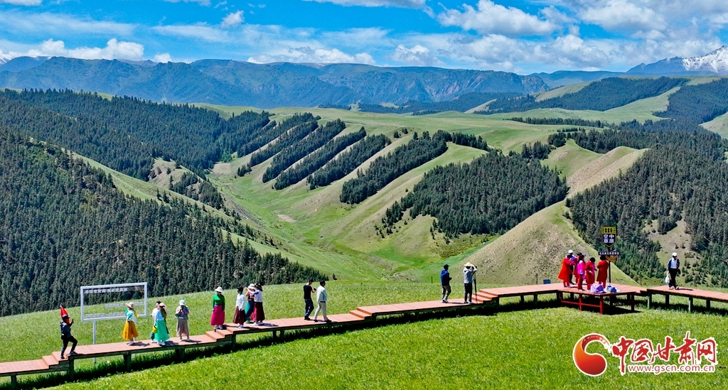 6月21日,游客在被誉为“空中草原”的祁连山国家公园甘肃省张掖市肃南裕固族自治县康乐草原段,领略雪山、森林、草原、蓝天融为一体的旖旎风光。