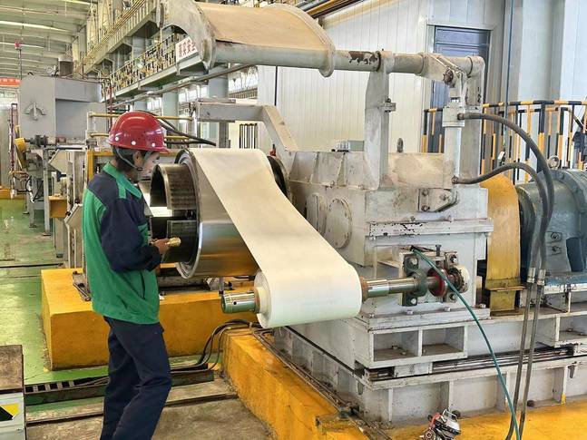 记者来到金川集团镍合金公司高温合金生产现场,多条生产线正在高速运转,一排排熔炼后的镍板正在通过轧制加工等工序制作成成品后包装发往国内外订购商家。工作人员向记者介绍,现在手头的这批订单制作已接近尾声。金川集团镍合金公司冷轧操作员卢宇:【成品表面要求是很高的,轧出来之后跟一个镜子一样,而且表面很光滑,大部分用在航空航天、电池、还有核工业领域,这是一个韩国的订单,从5.5毫米最后达到0.077毫米,这个是5月到6月的单子,现在基本上已经到尾声了。】