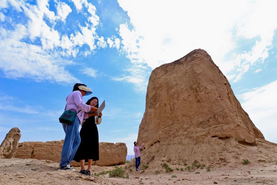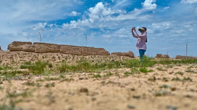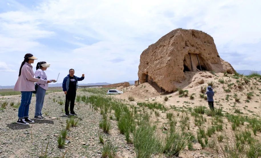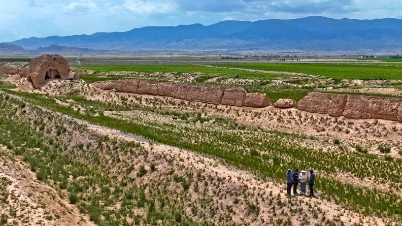 6月27日,甘肃省张掖市山丹县汉明长城保护研究中心工作人员在汉明长城并行最窄处进行壕堑和墙垣数据采集。