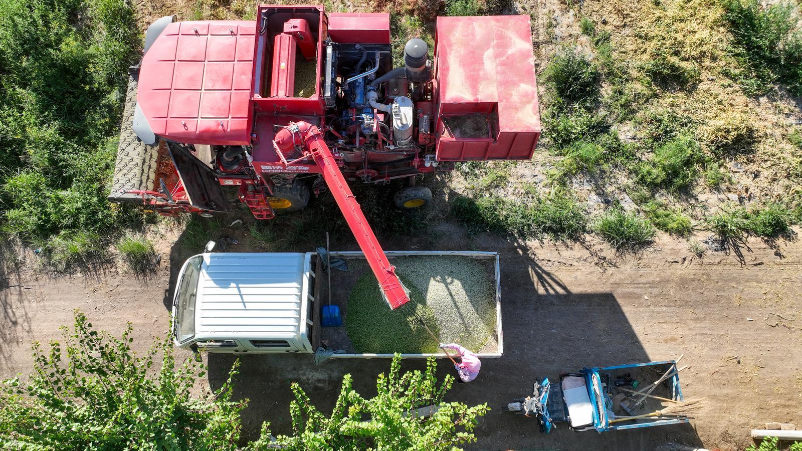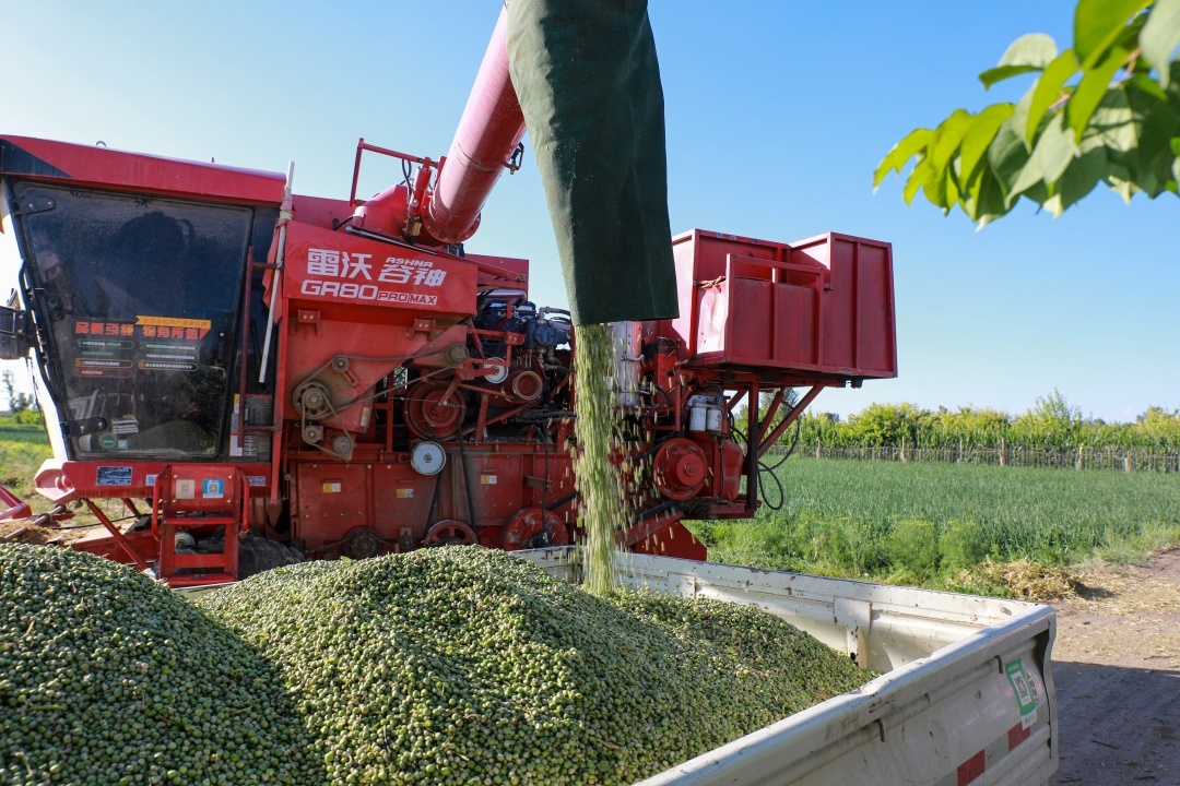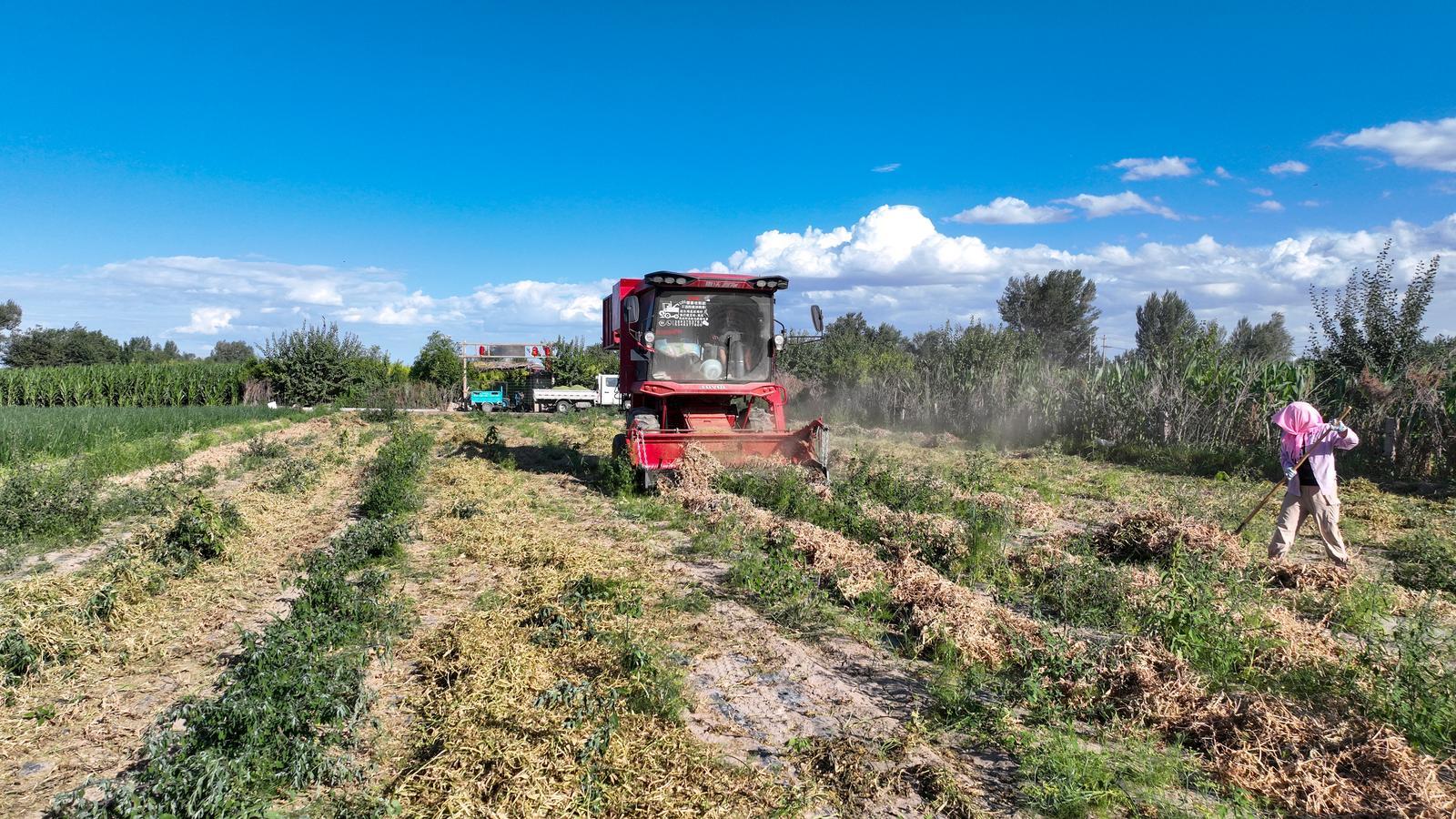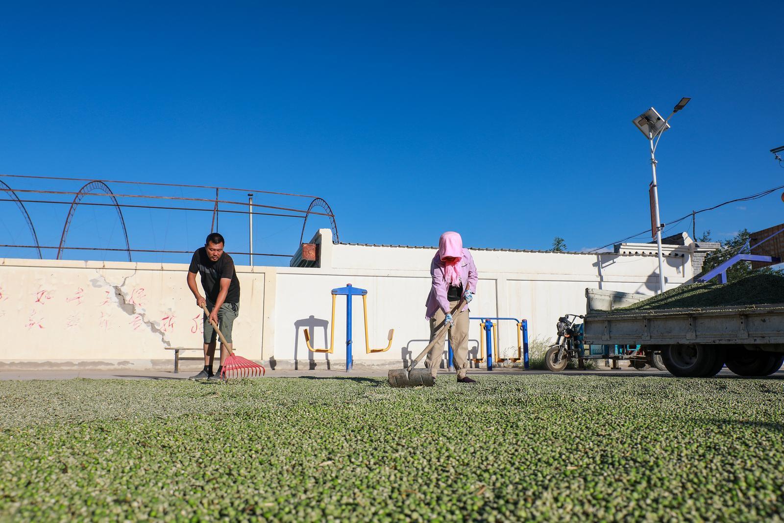 盛夏时节,草木葱茏,金塔县金塔镇的绿豆迎来黄金收获期。