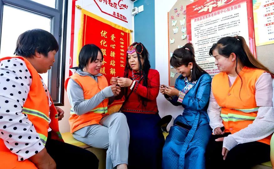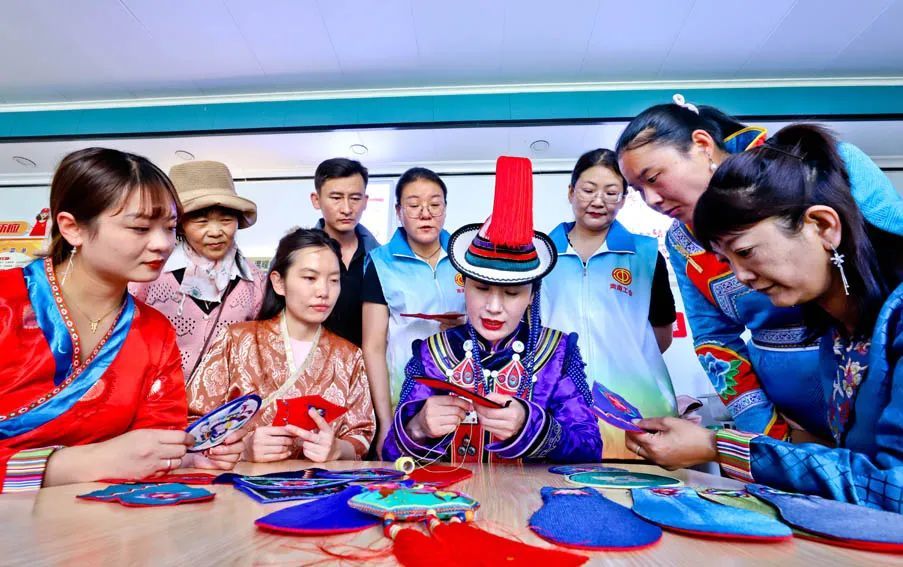 7月2日,在肃南裕固族自治县户外劳动者爱心驿站,非遗传承人杨海燕应县总工会邀请,利用中午休息时间向劳动者们传授裕固族服饰刺绣技艺。