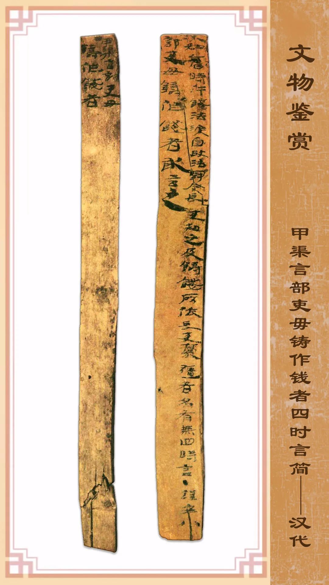 这枚汉简所处的时代,当是建武六年前后,甲渠候官应上级政令,要求认真检查部吏中有无地方长吏豪强私自铸钱的行为,并要求如实上报。为此,甲渠候官给上级部门作了本部吏无私铸钱的覆文。此简对于研究东汉初期河西地区的社会局势和经济状况有一定参考价值,现藏甘肃简牍博物馆。(苏阳 整理)