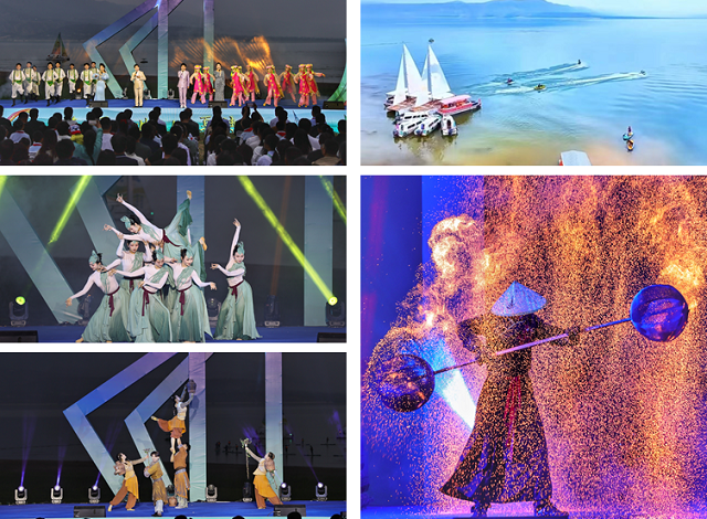 当晚的演出在集中展示当地水上旅游项目的实景展示《浪漫三湾》中拉开帷幕,观光竹筏、帆船、水上飞机等游弋于碧波之上,让广大观众领略到临夏旅游业不断提升的内涵和积极推动文旅产业提档升级所取得的成效。随后,花儿联唱《梧桐令》《花儿与少年》《尕老汉》《恭喜曲》,唱出了河州儿女对幸福美好生活的热情赞美。诗朗诵《临夏赋》道尽河州大地的历史沧桑、人文荟萃与群众生活的日新月异。富有水乡婉约特色的柔美舞蹈《临夏韵》,与河道上的帆船、桨板相映成辉,国风雅韵与水上运动浑然天成。杂技融合剧《禹陶魂》与古诗词《宁河城》《积石奔流》《雪山》《陈子昂谈河州牡丹之怅然有作》融入富有彩陶和临夏州多民族元素的时装展示,观众被临夏从古至今的诗情画意和唯美浪漫所折服。舞蹈《盛世牡丹》,展示了新时代牡丹之乡大踏步向前的豪迈与河州儿女打造宜居宜业宜游新临夏的自信从容。诗朗诵《黄河文化千古流》,将岁月长河中的临夏历史人文变迁,注入美妙的诗篇,与自然风光展示一起让观众叹为观止。歌曲《临夏欢歌》唱出了各族儿女同心协力团结奋斗迎接明天的昂扬斗志。当晚的演出在绽放的烟花和非遗火壶《激情燃烧》、打铁花中落下帷幕。“东风夜放花千树。更吹落,星如雨。”夜晚的水光映照着满场的火树银花,观众们报以热烈的掌声和欢呼声,久久不愿离去。