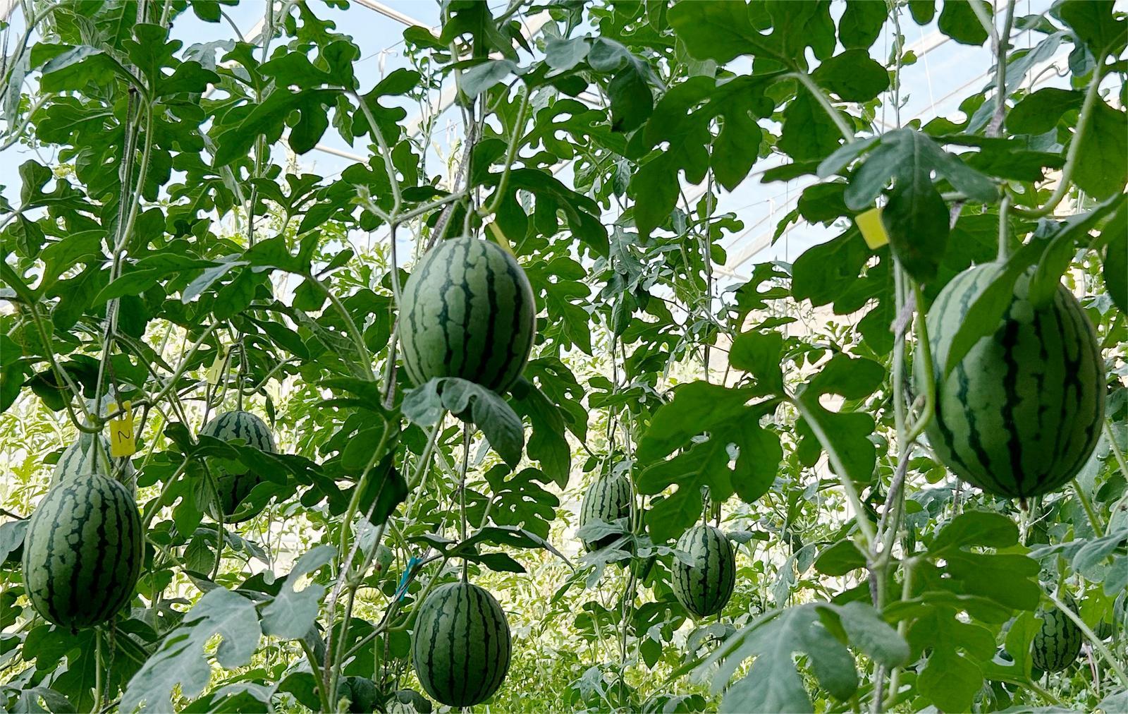 在西沟村村民童荣荣的温室大棚里,满眼都是醉人的葱茏新绿,油亮亮、圆滚滚的西瓜错落有致地“吊挂”在瓜秧上,散发出诱人的香甜。一大早,童荣荣就在大棚里忙活起来,在采摘西瓜的间隙,也不忘在朋友圈里“吆喝一嗓子”新鲜西瓜上市啦。