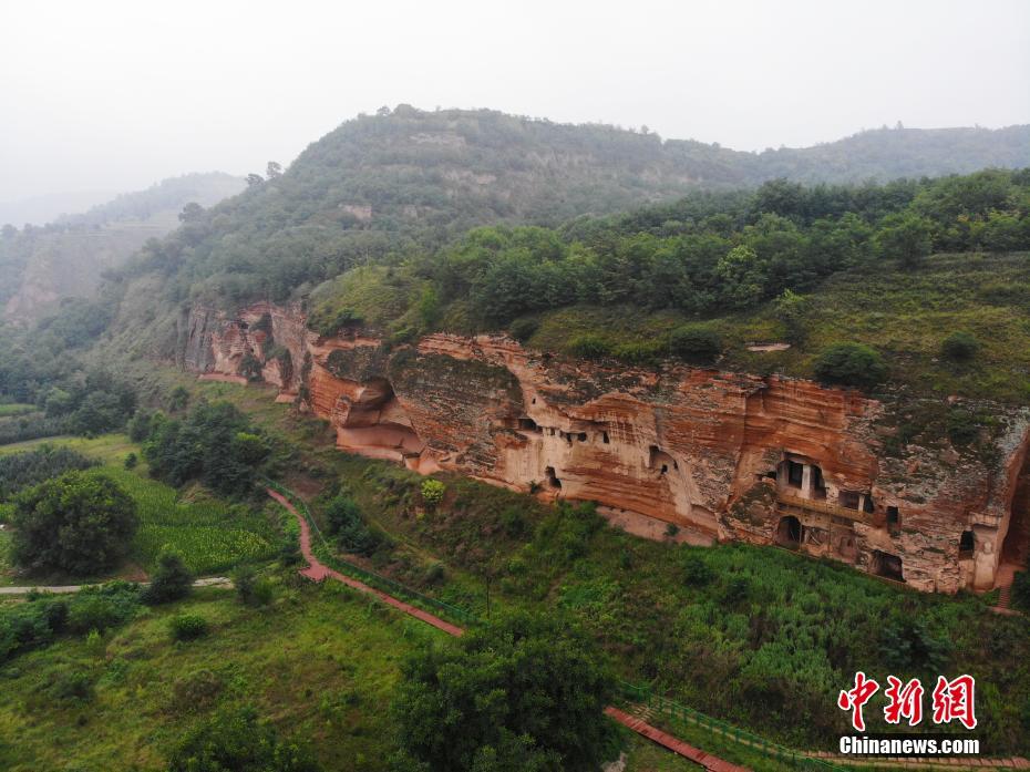 7月15日,航拍甘肃省平凉市泾川县百里石窟长廊中的罗汉洞石窟。百里石窟长廊位于泾川县境内,由512个石窟、5眼窟中石井组成,现存王母宫石窟、凤凰山石窟、南石窟寺、丈八寺石窟、罗汉洞石窟、太山寺石窟等规模较大的石窟群,还有数量众多的小石窟群。罗汉洞石窟遗存40余个窟龛,以北魏至清代风格为主。(无人机照片)中新社记者 李亚龙 摄