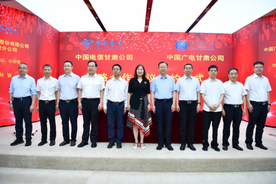 中国广电甘肃公司董事长郭智强、中国电信甘肃公司总经理孙岩出席签约仪式并致辞。中国广电甘肃公司总经理赵星军,中国电信甘肃公司副总经理魏荣军分别代表双方在战略合作协议上签字,中国电信甘肃公司副总经理王久衡主持签约仪式。
