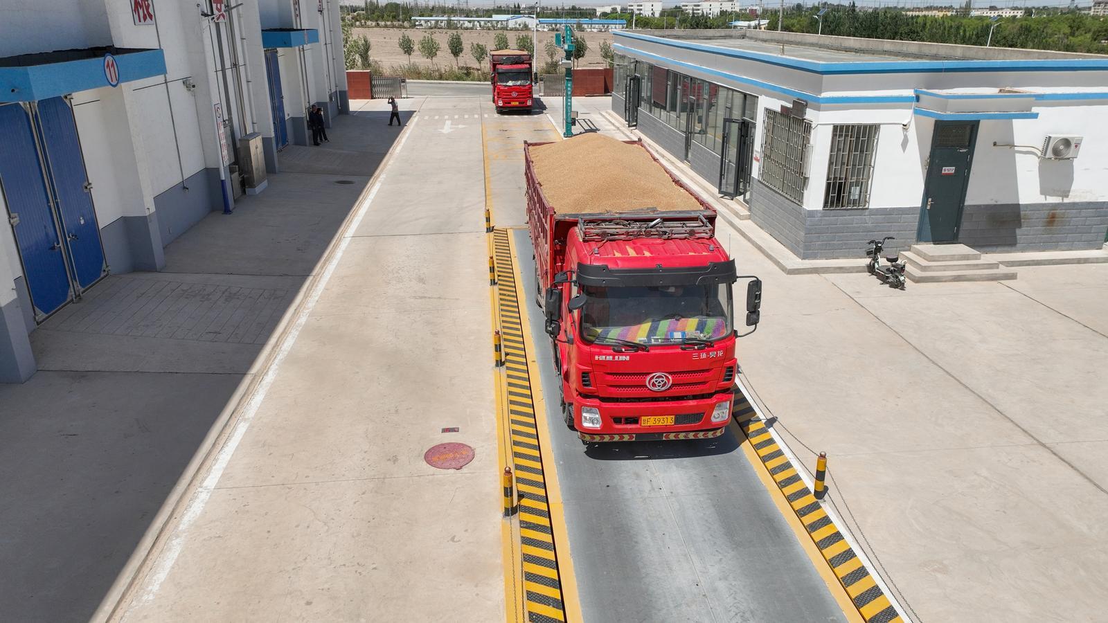 在金塔县金泰粮食储备有限责任公司,前来售粮的农民络绎不绝。一辆辆满载着金灿灿小麦的车辆有序排队,粮站工作人员认真地逐一对每辆车上的小麦进行取样抽检、过磅秤重,并安排卸粮入库。农户们则耐心地等待着开票结算,现场各项工序有条不紊。