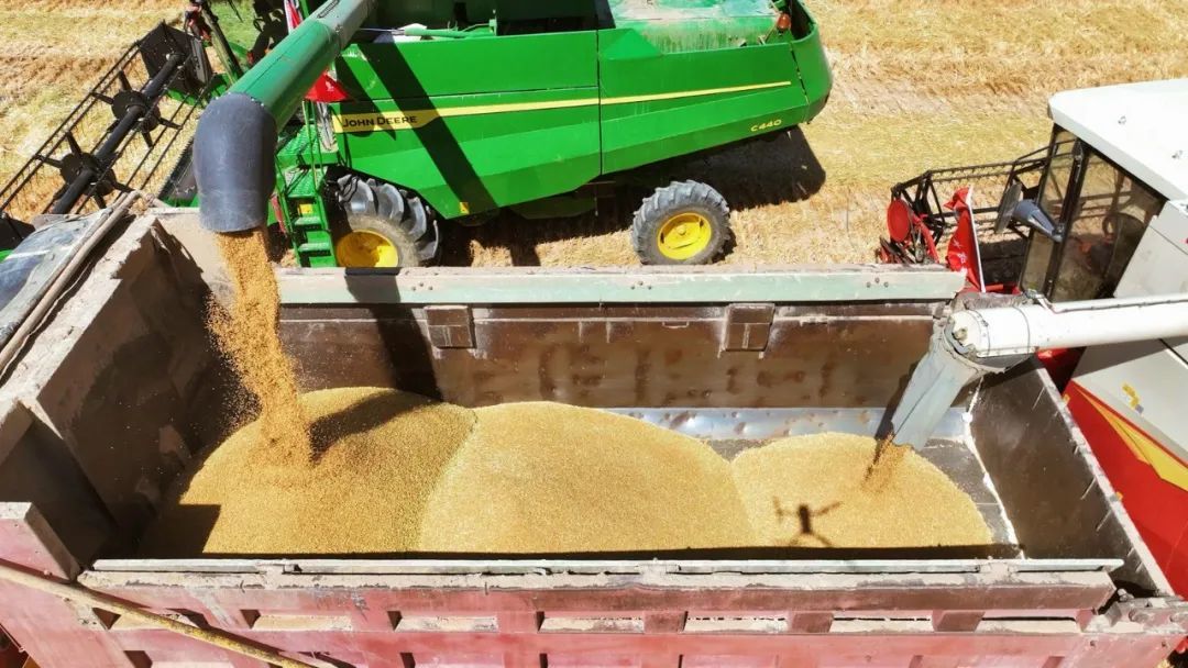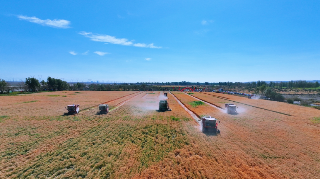 在瓜州县西湖镇双塔农场,数台大型联合收割机开足马力,在麦田中忙碌穿梭,确保小麦颗粒归仓。