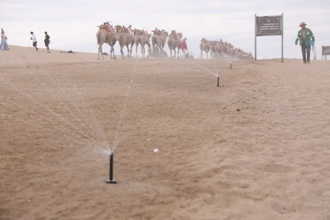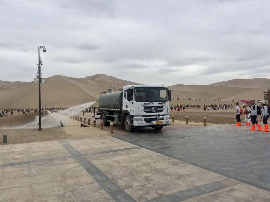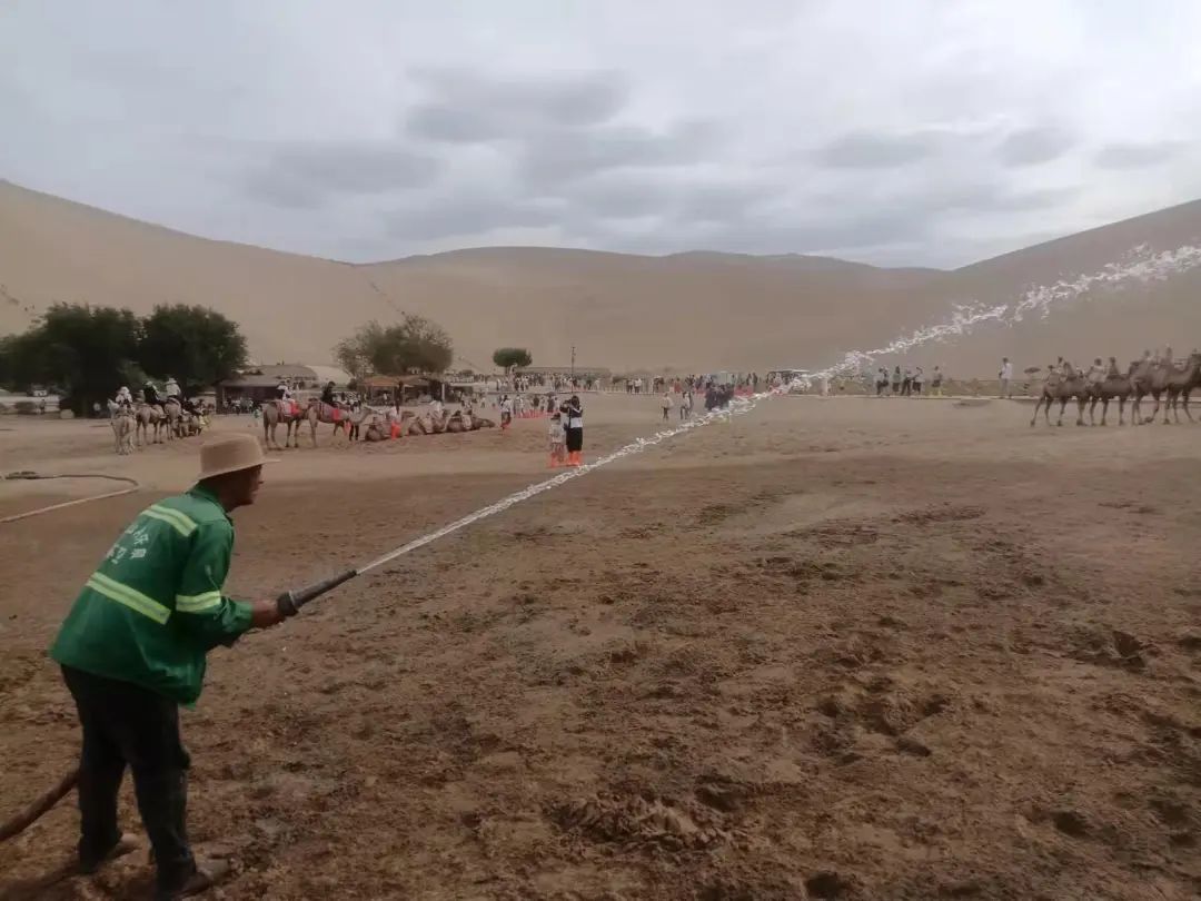 景区在检票口、驼运售票长廊等游客大量聚集区设置了雾森喷淋系统,在各经营项目售票点布置冷风机、水循环风扇等设备。每天不定时在道路主干道洒水10余次,在沙地道路及驼道安装喷淋设施200余个,购置5台大型喷雾降尘机每天连续工作4小时以上,有效改善了小气候环境,减少了沙粒飞尘,为游客提供了清凉、干净的游览环境。
