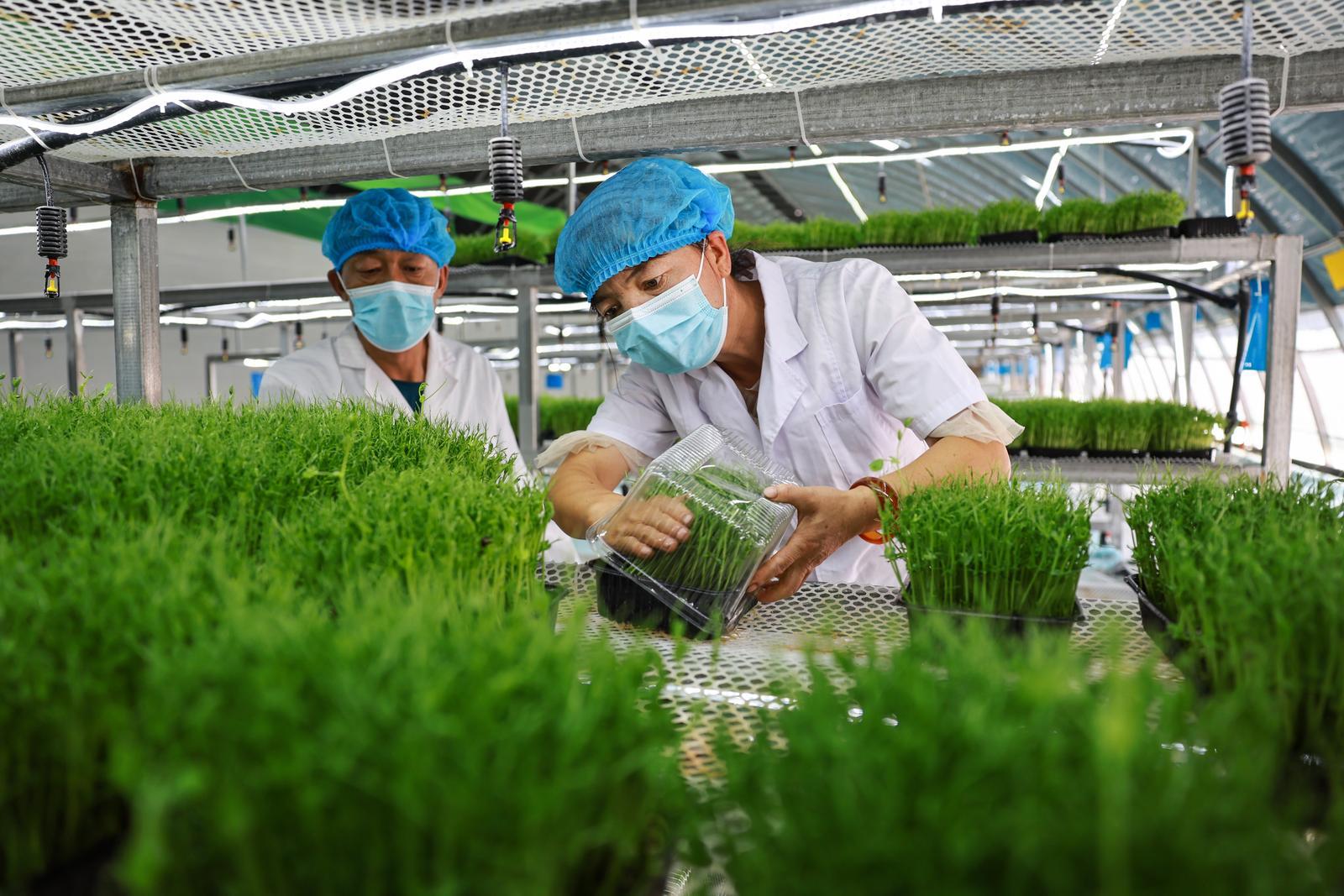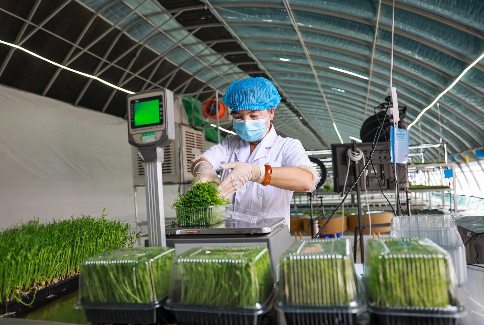 8月7日,金塔县西坝镇健康生态农业产业园甘味良禾果蔬供应基地的生产车间里,工作人员正科学有序地进行着浇水、收割、分装芽苗菜。