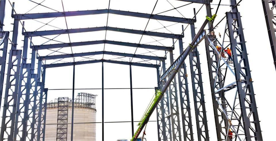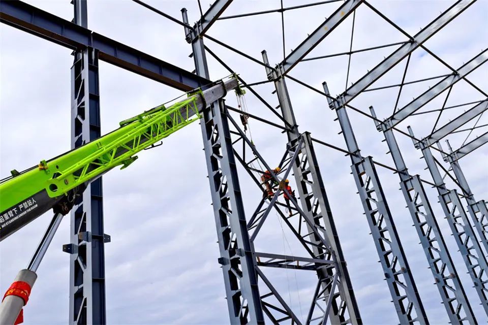 8月9日,位于甘肃省张掖市山丹县东乐滩的张掖LNG储备中心二期项目建设现场,工程建设者们正在进行压缩机车间的钢架梁吊装和焊接。