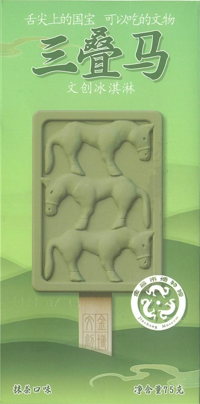 “作为穿缀在皮袍上或腰带上的装饰品,三层伫马铜饰牌不仅展现出春秋战国时期沙井文化先民杰出的青铜铸造工艺,更可见先民们对马的情有独钟。”李勇杰说,今夏,金昌市博物馆推出抹茶味的“三叠马”文创雪糕,造型简洁逼真,口感细腻绵长,正契合夏季游客群体的消费需求,希望文物也可以很“美味”,让馆藏国宝级文物更加深入人心。