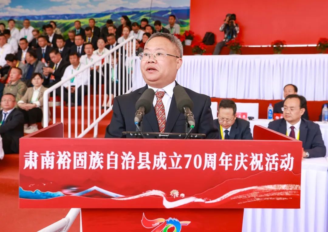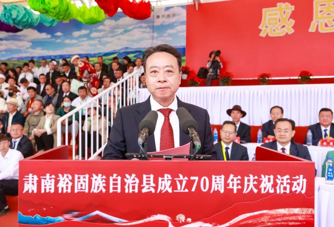 卢小亨代表市委、市人大常委会、市政府、市政协和全市人民向中央有关部门和省祝贺团、兄弟市州县区表示热烈欢迎和衷心感谢,向肃南各族群众和各界人士致以节日祝贺和诚挚问候,向长期关心支持肃南发展的中央国家部委、定点帮扶单位、省直厅局部门以及社会人士致以真诚谢意和崇高敬意。他指出,肃南是全国唯一、甘肃独有的裕固族自治县。70年奋斗历程中,肃南县沿着民族区域自治的正确道路,积极投身社会主义建设和改革开放事业,绘就了从闭塞走向开放、从落后走向进步、从贫穷走向富裕的恢宏画卷。特别是党的十八大以来,在以习近平同志为核心的党中央坚强领导下,各族群众铸牢中华民族共同体意识,铿锵激昂地与全国全省同步全面建成小康社会,昂首阔步迈上社会主义现代化建设新征程,经济发展日新月异、民族团结籽籽同心、生态环境山青水秀、人民生活幸福蝶变,取得了划时代、历史性、全方位的成就,成为新时代伟大变革在张掖大地的鲜活缩影。肃南翻天覆地变化、辉煌成就的取得,不仅是中国特色社会主义制度优越性的生动体现,更是民族区域自治制度旺盛生命力的璀璨绽放。站在新起点上,希望肃南县始终把铸牢中华民族共同体意识作为新时代党的民族工作和民族地区各项工作的主线,深入贯彻落实习近平总书记对甘肃重要讲话重要指示批示精神,聚焦“一屏三地”功能定位,以建设各民族共同富裕先行区为统揽,更好统筹高质量发展和高水平保护、高水平安全,加快建设山川秀美、民族团结、经济发展、社会和谐的幸福美好新肃南。要坚定不移加强党的全面领导,持之以恒深化民族团结进步,久久为功筑牢生态安全屏障,更大力度推动高质量发展,奋力谱写中国式现代化肃南实践新篇章。