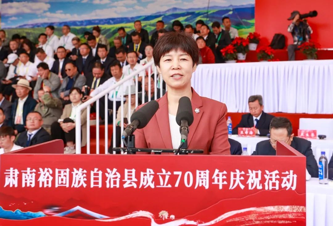 赵金云代表省委、省人大常委会、省政府、省政协和全省人民向肃南县各族干部群众表示祝贺,向莅临庆祝大会的中央有关部门祝贺团和各位嘉宾表示热烈欢迎,向长期以来所有关心和支持肃南发展进步的各界朋友表示衷心感谢。她指出,70年岁月峥嵘、赓续奋斗,肃南大地山河锦绣、面貌一新。特别是党的十八大以来,在以习近平同志为核心的党中央坚强领导下,在习近平新时代中国特色社会主义思想科学指引下,肃南各族干部群众感党恩而奋起、担使命而图强,经济发展实现历史性跨越、生活条件实现历史性转变、生态环境实现历史性改善、民族团结实现历史性进步,各项事业发展取得全方位历史性成就。70年的辉煌成就,是党中央坚强领导、亲切关怀的成果,是全省上下倾力支持、倾情帮助的结果,是全县各族干部群众守望相助、共同奋斗的结果。实践证明,只有毫不动摇坚持中国共产党领导,坚持走中国特色社会主义道路,坚持民族区域自治制度,坚持铸牢中华民族共同体意识,肃南才能拥有繁荣富裕、和谐美好的今天,才能开创赢得更加灿烂辉煌的明天。肃南县要以成立70周年为新的起点,坚持以习近平新时代中国特色社会主义思想为指导,认真学习贯彻党的二十大和二十届二中、三中全会精神,全面落实习近平总书记对甘肃重要讲话重要指示批示精神,紧扣实际扎实推进现代化建设,加强党的全面领导,树牢高质量发展航向标,坚持绿色生态发展,擦亮高质量发展主色调,持续改善民生福祉,增强高质量发展获得感,铸牢中华民族共同体意识,绘就高质量发展同心圆,在新征程上不断开创高质量发展的新篇章,为加快推进中国式现代化甘肃实践贡献肃南力量。