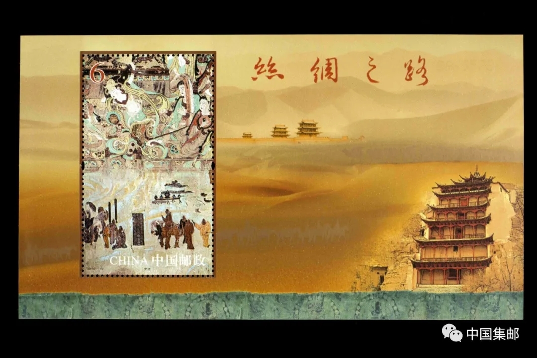 (注:邮票图案为敦煌壁画中唐代《反弹琵琶图》和《张骞出使西域图》上下组合而成)