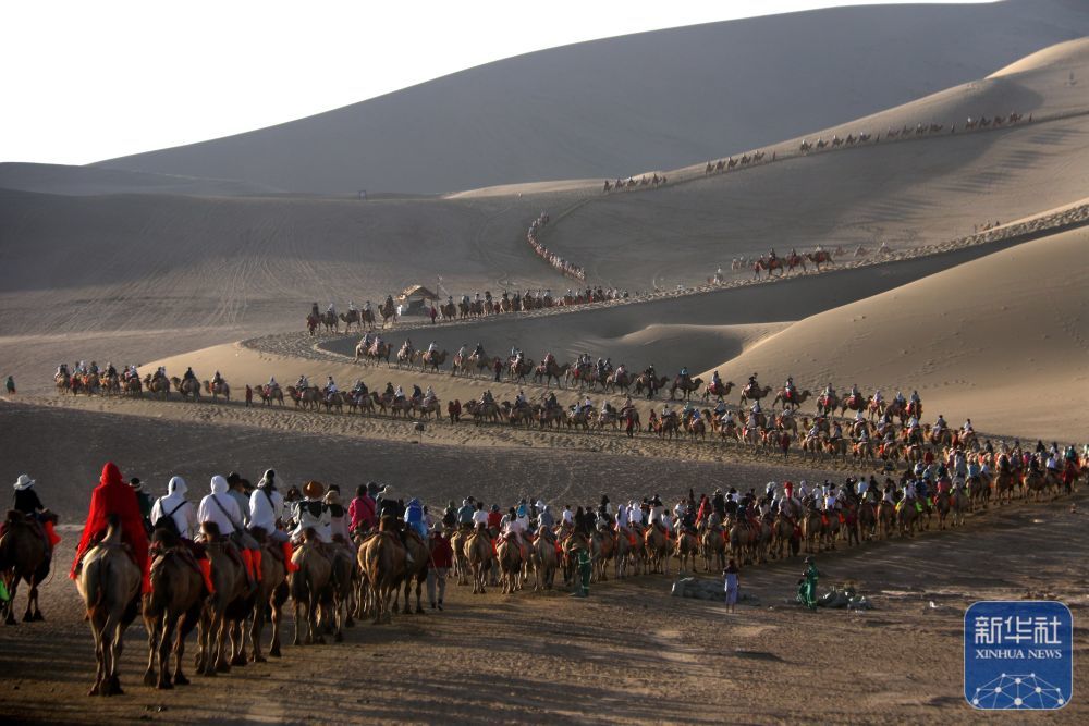 8月13日早晨,游客在敦煌市鸣沙山月牙泉景区骑骆驼游览。