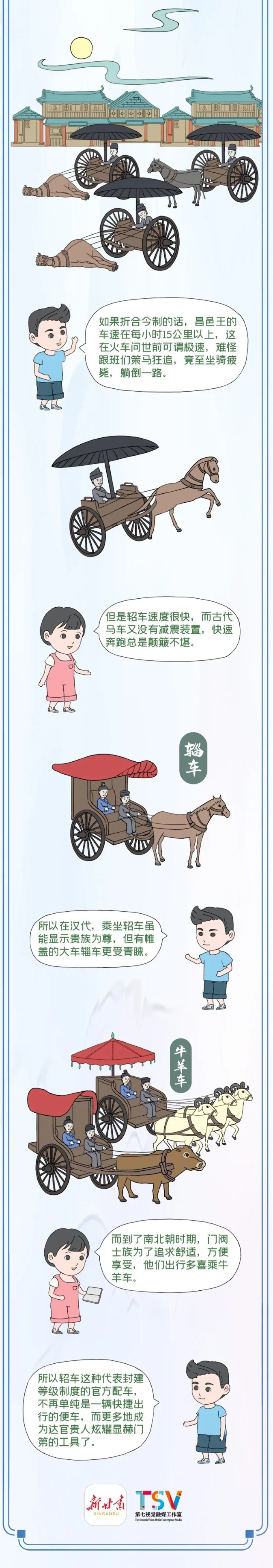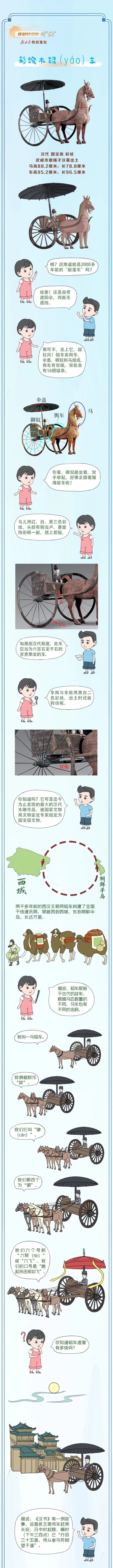 轺车何以名“轺”?东汉末年成书的《释名》说:轺,遥也。四向远望之车也。车厢无遮挡,视线自然远,车体轻快,自然跑得远。在我国古代史书中多有记载。《墨子》载:“杂守以轺车,轮轱广十尺。”《史记·季布栾布列传》载:“朱家乃乘轺车之洛阳,见汝阴侯滕公。”《汉书·平帝纪》载:“亲迎立轺并马。”“立轺”,立乘小车也,“并马”,俪驾也。《晋书·舆服志》也载:“轺车,古之时军车也。一马曰轺车,二马曰轺传。汉世贵辎而贱轺车,魏晋重轺车而贱辎。三品将军以上尚书令,轺车黑耳有后户,仆射但有后户无耳,并皂轮。尚书及四品将军,则无后户,漆毂轮。其中书监令如仆射、侍中、黄门、散骑、初拜及谒陵庙,亦得乘之。”从以上记载可以看出,轺车是古代一种交通工具,专供上层贵族、相、侯或者帝王乘坐的一种轻便马车。(文物天地)