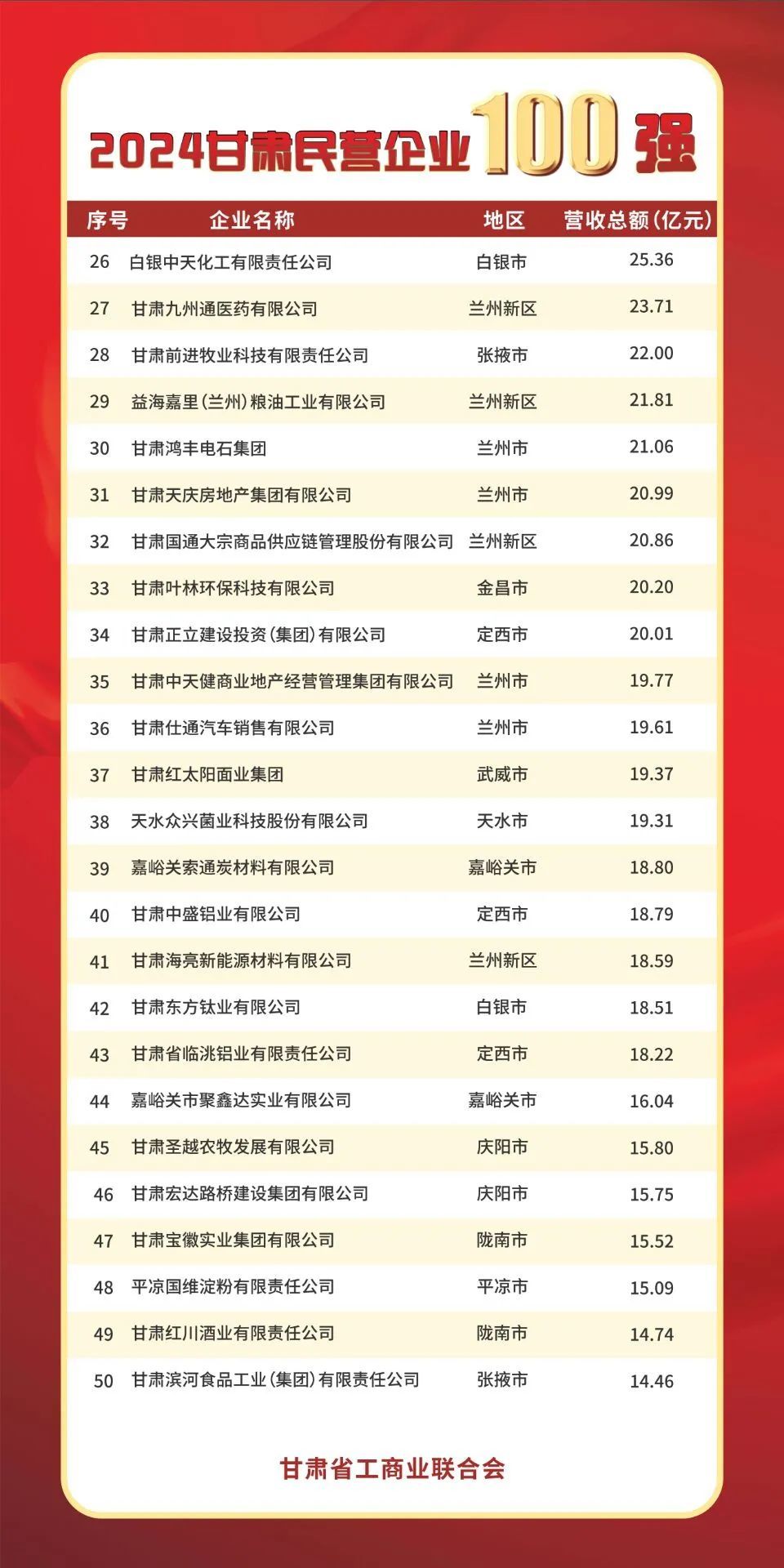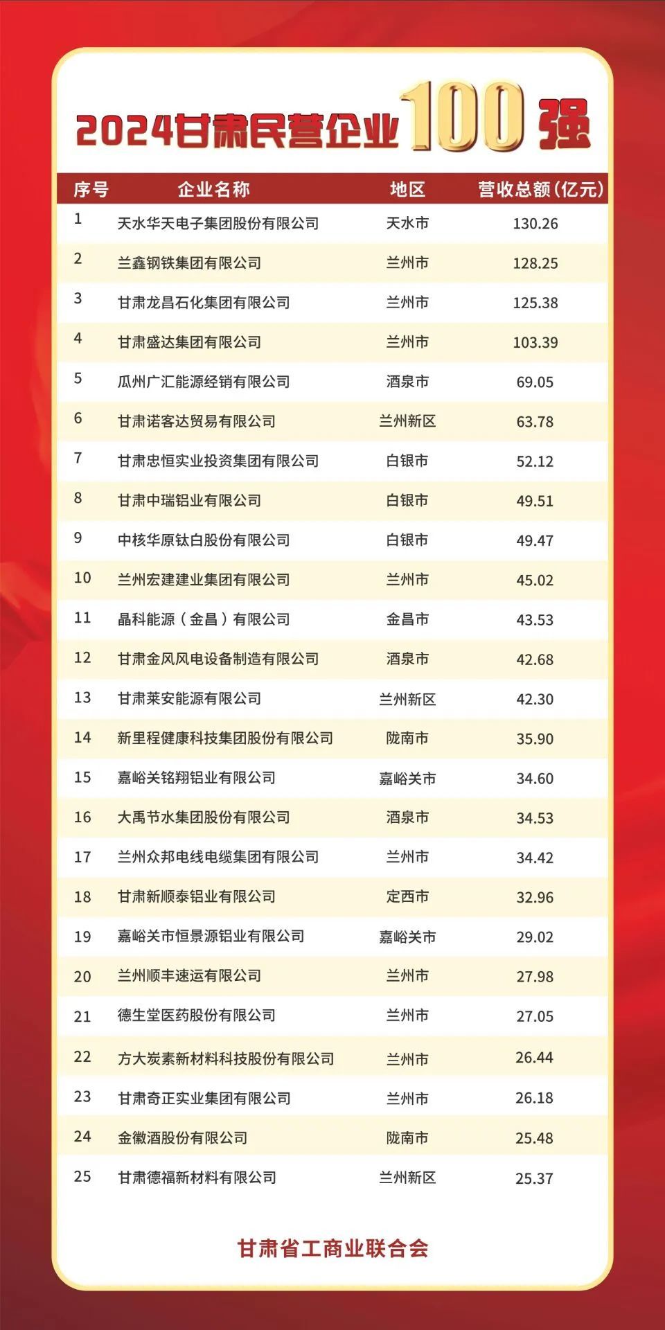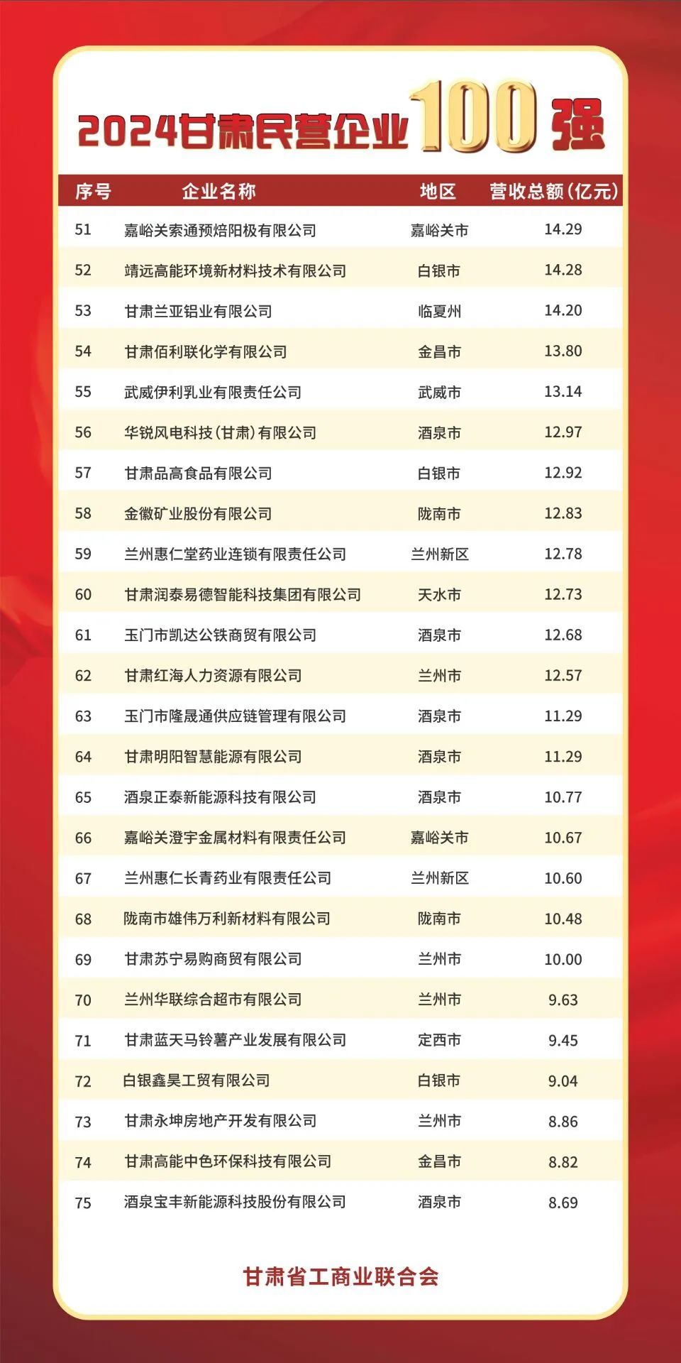 8月16日,甘肃省工商业联合会发布2024甘肃民营企业100强,榜单如下: