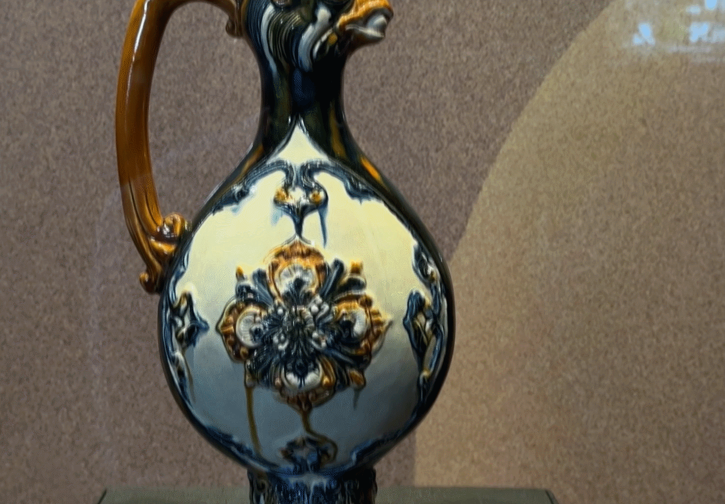 萨珊是3—7世纪今伊朗一带的一个王朝,秦汉到唐宋时期,萨珊王朝与中国贸易往来频繁,这种壶在萨珊、粟特银器中极为流行,其奇特的造型极富装饰性,传入中国后很快就成为瓷器模仿的对象,对唐三彩产生了深远的影响。