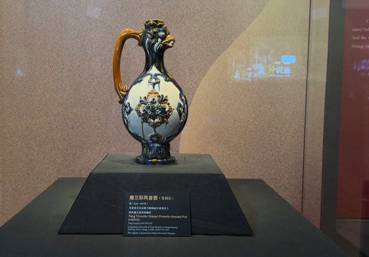 出土于甘谷县唐三彩凤首壶,为国家一级文物,壶高31厘米, 口径4厘米,通体施绿、黄、褐、白等釉色,色彩绚丽多姿, 壶形柔软流畅,是唐三彩中极为罕见的艺术瑰宝。