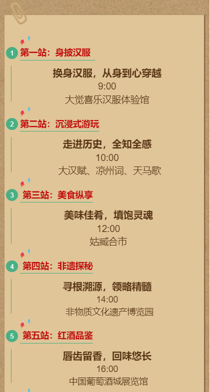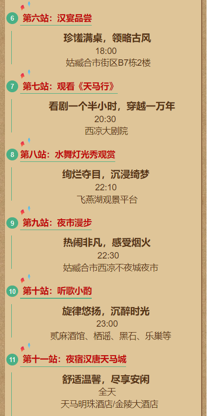听干古传唱、赏歌舞凉州。街区巡游快闪特色活动巧妙结合传统节气风俗,融合五凉古都的人文底蕴,以巡游演绎、舞蹈表演、互动表演、情景表演、游戏互动、沉浸式体验的表演方式向广大游客展现出多样精彩的汉唐天马城。通过绚丽的舞美、璀璨的灯光、巧妙的编创以及专业的表演,让您在景区游览时可以全新的观感体验“凉州乐舞”文化。