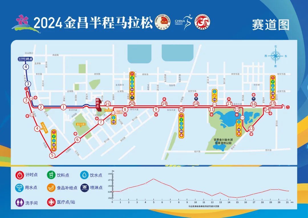 整条赛道最低点海拔:1504米,最高点海拔:1545米,海拔高度差41米。总的来说,赛道向西行进时,整体处于慢上坡状态,而赛道向东行进时,则整体处于慢下坡状态。需要提醒各位参赛选手,2024金昌半程马拉松属于亚高原路跑赛事,且天气逐渐转凉,请在参赛前做好充分赛前准备,做自己健康安全第一责任人!