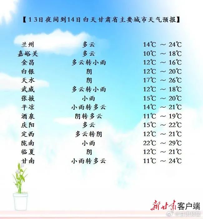 9月13日夜间到14日白天,张掖、金昌两市多云转阴有小雨,局部地方有中雨;武威市及兰州市北部、白银市北部多云转阴,部分地方有小雨;甘南、陇南两州市阴或多云,部分地方有阵雨或小雨;酒泉、嘉峪关两市多云,有4至5级偏东风,山区和沿山地区阴有阵雨,省内其余地方多云,局部地方阴有小雨;
