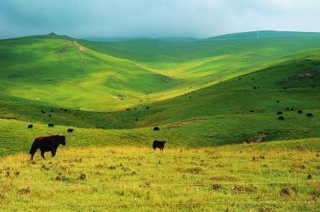 秋阳下,草原公路蜿蜒如带,草原上牛羊悠闲地吃草,巨大的风车高耸入云,在草地上不时投下转动的光影。微风拂面,令人心旷神怡。