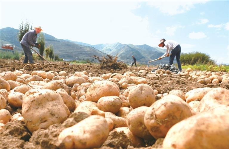 近日,岷县十里镇大沟寨村农民正在采挖分装马铃薯。今年,该镇种植的5900亩冀张薯12号等系列早、晚熟马铃薯喜获丰收,并全面进入收获期,当地种植农户正在采挖收获。