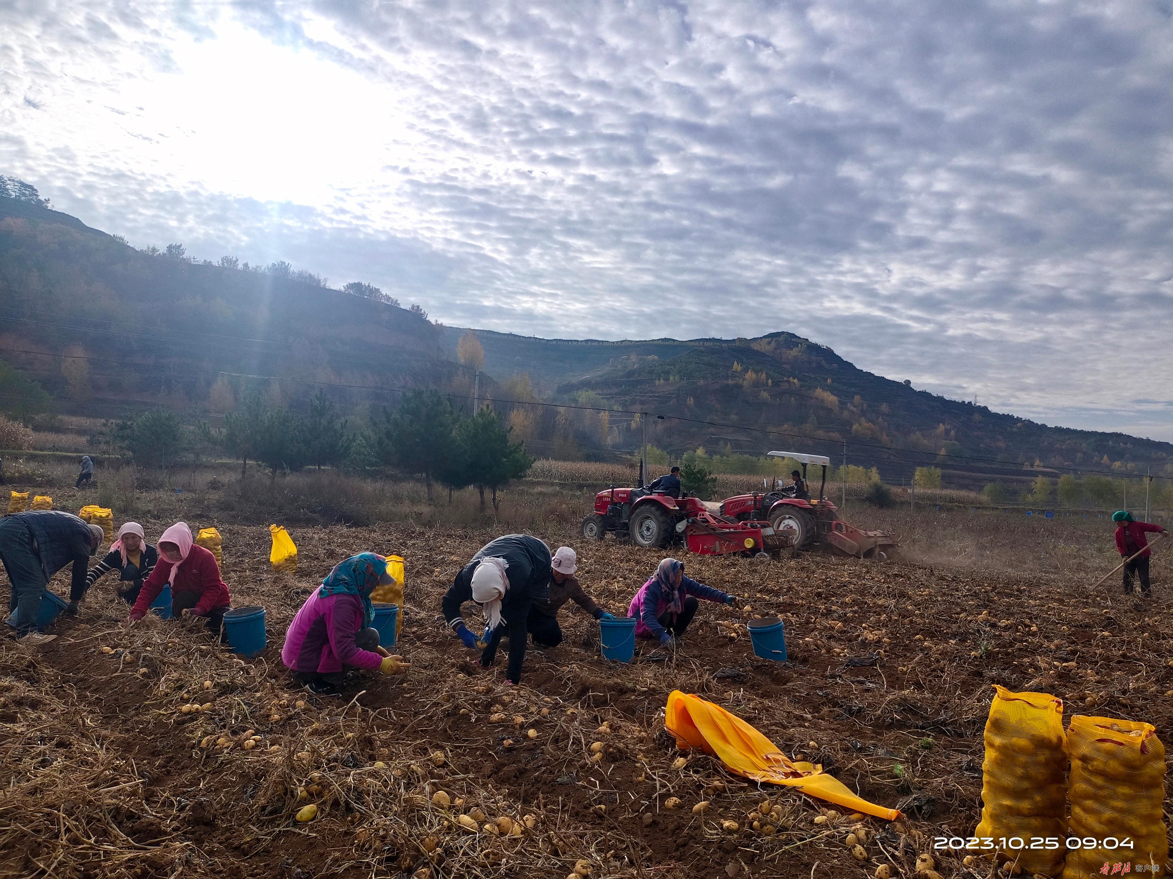 秋日好风景,田间地头话丰收。时下,走进庄浪县永宁镇,梯田绵延起伏、线条分明、高低错落,尽显庄浪梯田身披“黄金甲”绝美风光,蔚为壮观。远眺地埂,大小不一的“金蛋蛋”马铃薯在层层叠叠的梯田中露头翻滚,忙碌的农民个个喜笑颜开,抢抓晴好天气,加速采挖马铃薯,一派繁忙的丰收景象尽展眼前。