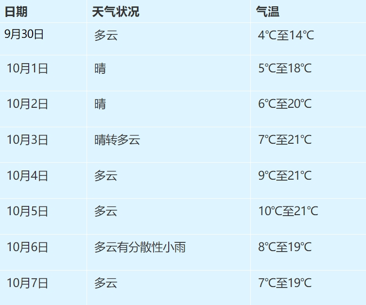 国庆假期,省内大部天气晴或多云