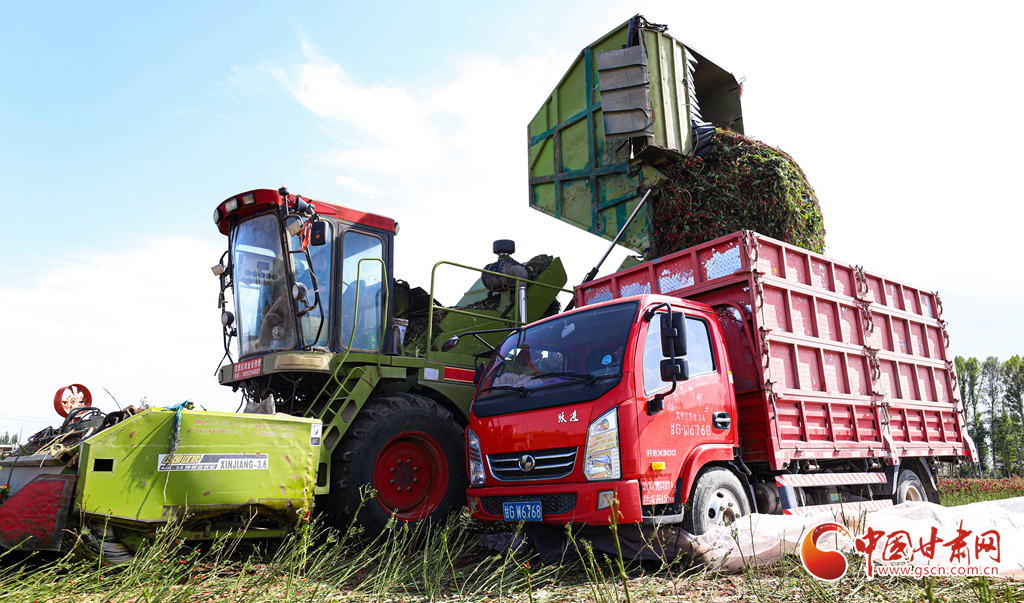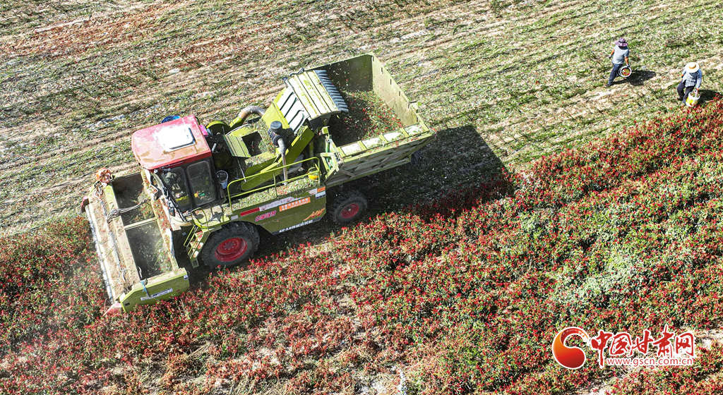近日,临泽县平川镇种植的3900多亩朝天椒进入采收期,朝天椒采收机马达轰鸣,在田地里来回穿梭,快速采收。种植农户们把采收的朝天椒运往晾晒场,经过分拣、晾晒、包装后发往山东、河南、安徽、重庆、贵州等地订单客户手中。