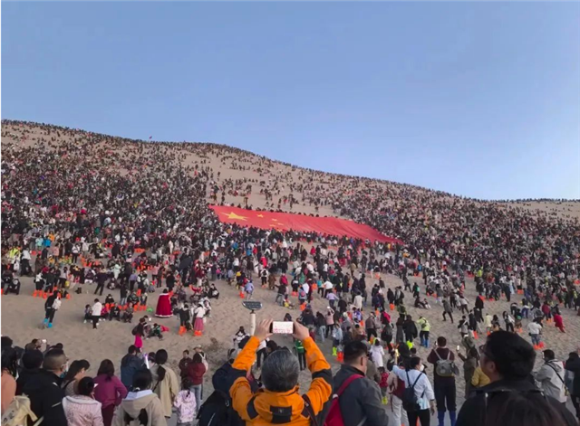 国庆佳节氛围浓厚。10月1日国庆假期首日,敦煌鸣沙山月牙泉景区国庆专场“万人星空演唱会”激情上演,数万游客同唱《今天是你的生日》《爱我中华》《万疆》《红旗飘飘》《我和我的祖国》等一首首振奋人心的爱国歌曲,用歌声表达对新中国成立75周年华诞的真挚祝福,共同祝愿伟大祖国繁荣昌盛。嘉峪关关城景区特别在夜游灯光剧中增加了庆祝国庆的画面,游客不仅能够欣赏到古老的城墙和烽火台,还能在光影交错中感受到浓厚的国庆氛围和强烈的爱国情感。