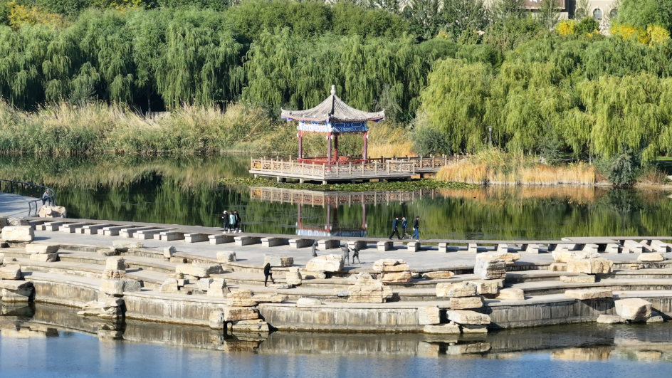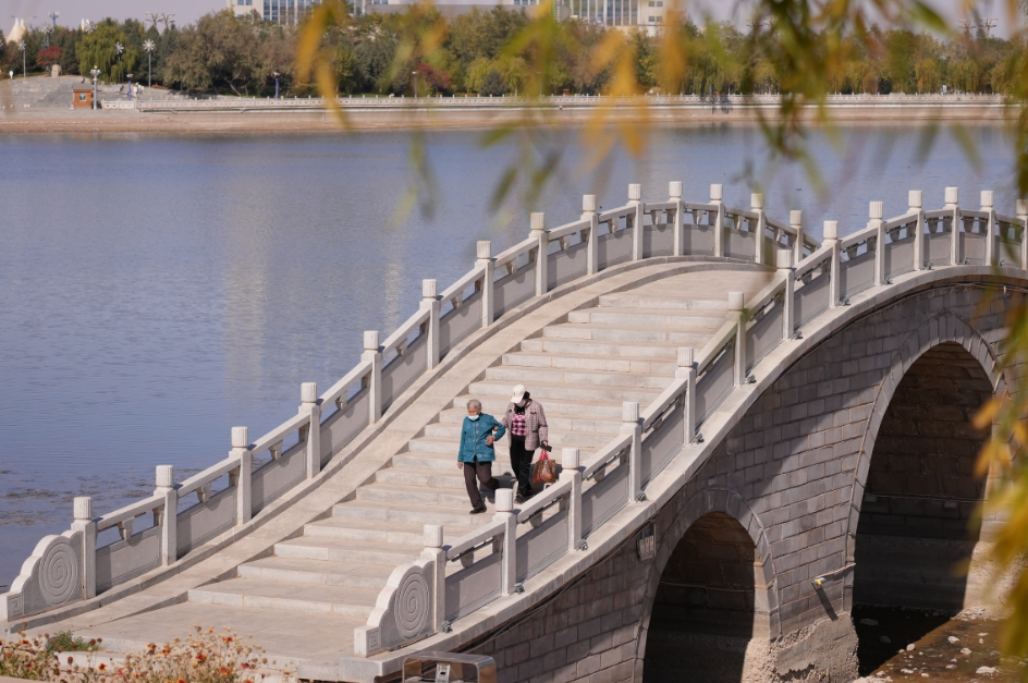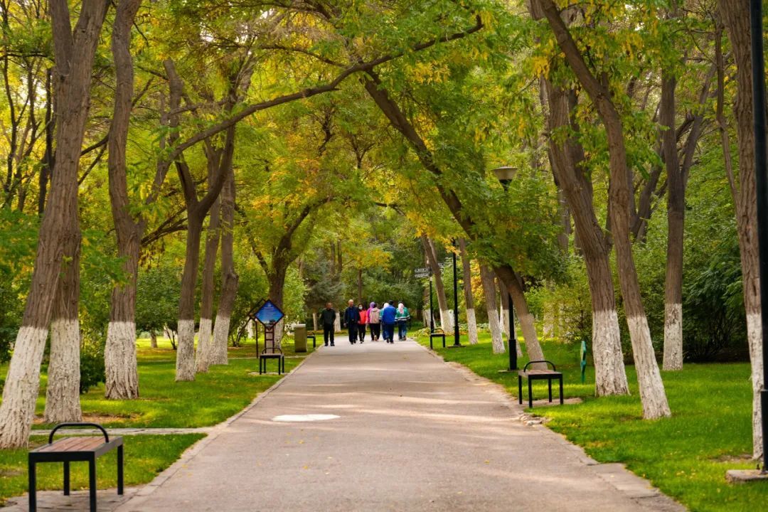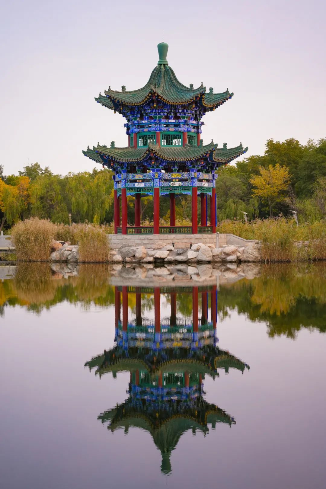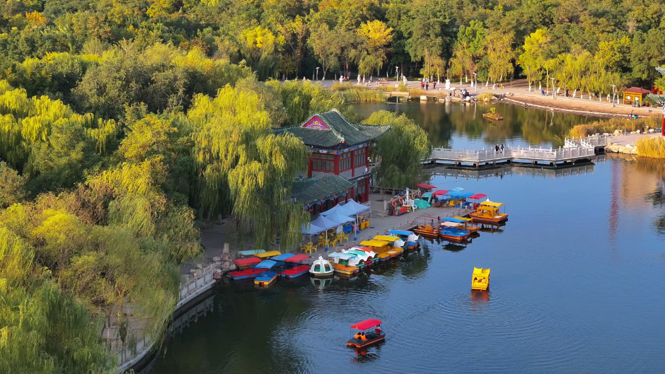 龙首湖的秋天五彩斑斓,湖岸一排排的树木,染上了秋天的色调,大片大片的金色,红色调几分绿色,又细细勾勒出了一层黄色。