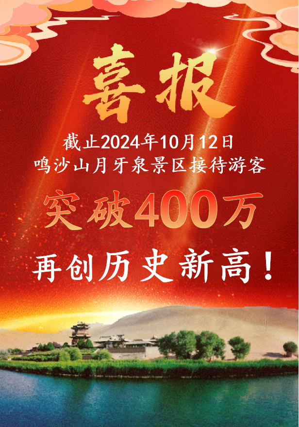 砥砺奋进新征程,凝心聚力再出发,“400万”这一里程碑式的数字,不仅是对鸣沙山月牙泉景区全体员工工作的肯定与鼓励,更是激励景区实现高质量发展的引擎和动力。景区将继续秉承工匠精神,以精益求精的态度持续提升旅游品质与服务水平,着力打造一个集友好氛围、沉浸式场景、全方位体验于一体的旅游胜地,为游客奉献独一无二、难以忘怀的旅游体验。