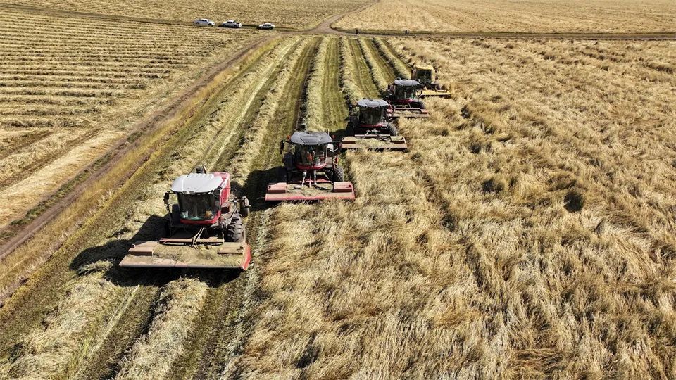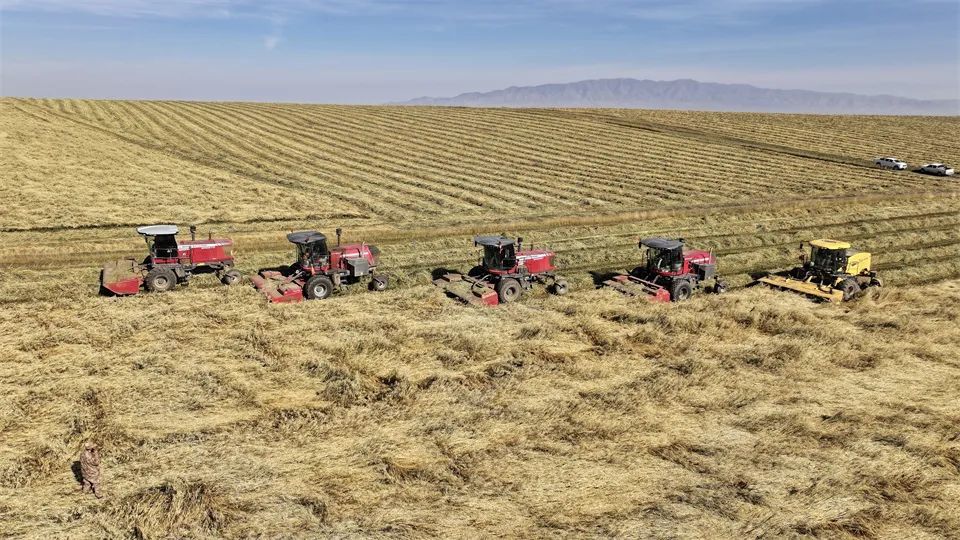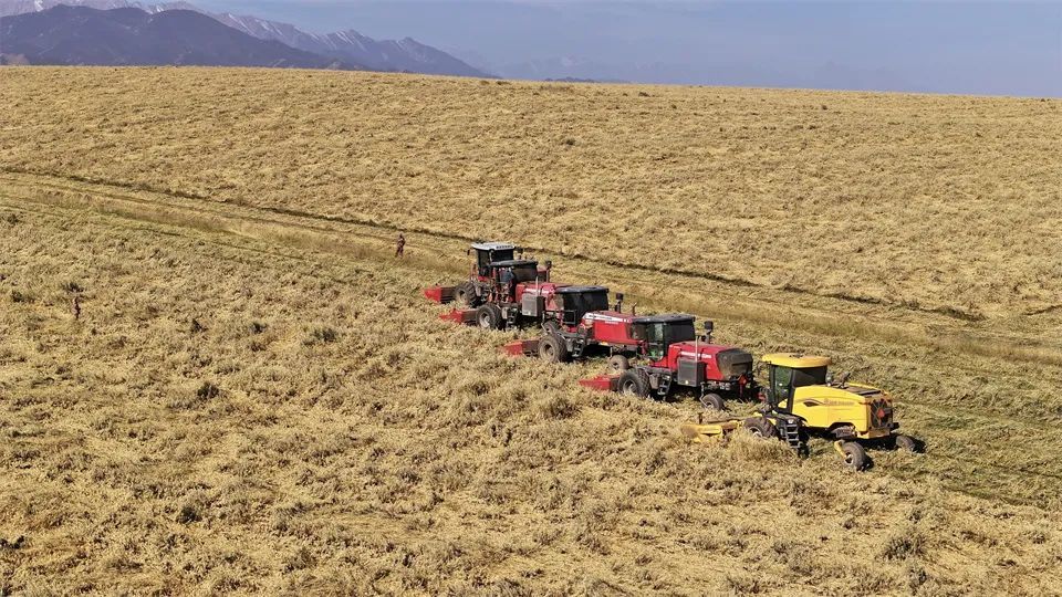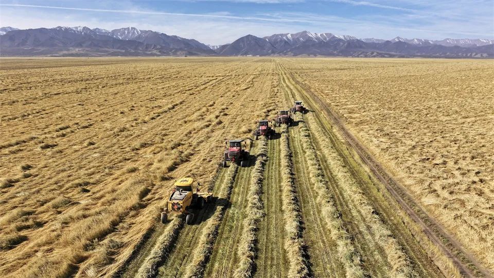 近日,张掖山丹马场一场的7万亩饲用燕麦草步入收获期。在广袤的田间地头,收割机与搂草机的轰鸣声此起彼伏,奏响了燕麦草收割作业的激昂乐章。收割、晾晒有条不紊地推进,全力确保颗粒归仓、寸草归垛。