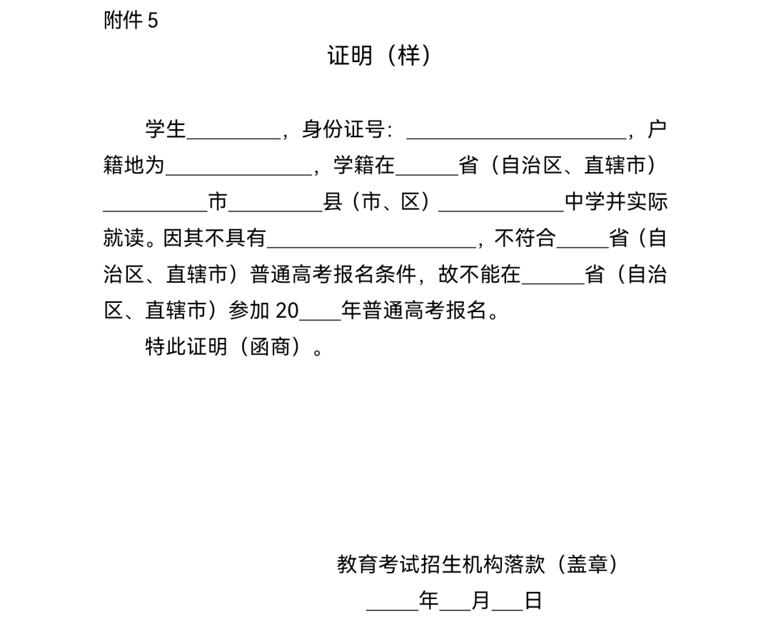 (2)按照教育部《2024年普通高等学校招生工作规定》“进城务工人员及其他非户籍就业人员的随迁子女接受高中阶段教育后在当地参加高考”要求,具有甘肃省户籍,出生后首次申报户口登记在甘肃(身份证号码前两位为62),无外省迁转记录,且父亲或母亲或法定监护人为我省常住户籍,在外省接受高中阶段教育的考生,在接受高中阶段教育省份报名。不符合接受高中阶段教育省份高考报名条件,不能在当地高考报名的考生,须具有外省学籍所在地教育考试招生机构出具的不能参加当地普通高考的证明或相关函件(样见附件5),并持相关人员户籍、学籍所在地教育行政部门出具的学籍、学业水平合格考考试成绩证明及综合评价信息等材料,申请在户籍所在县(市、区)报名参加普通高考。考生及父亲或母亲或法定监护人须对不能参加接受高中阶段教育省份普通高考的证明或相关函件的真实性负责,考生前往户籍所在县(市、区)教育考试招生机构进行资格审核时,签订《在甘外省份接受高中阶段教育考生参加甘肃省普通高考报名诚信承诺书》(见附件6)。