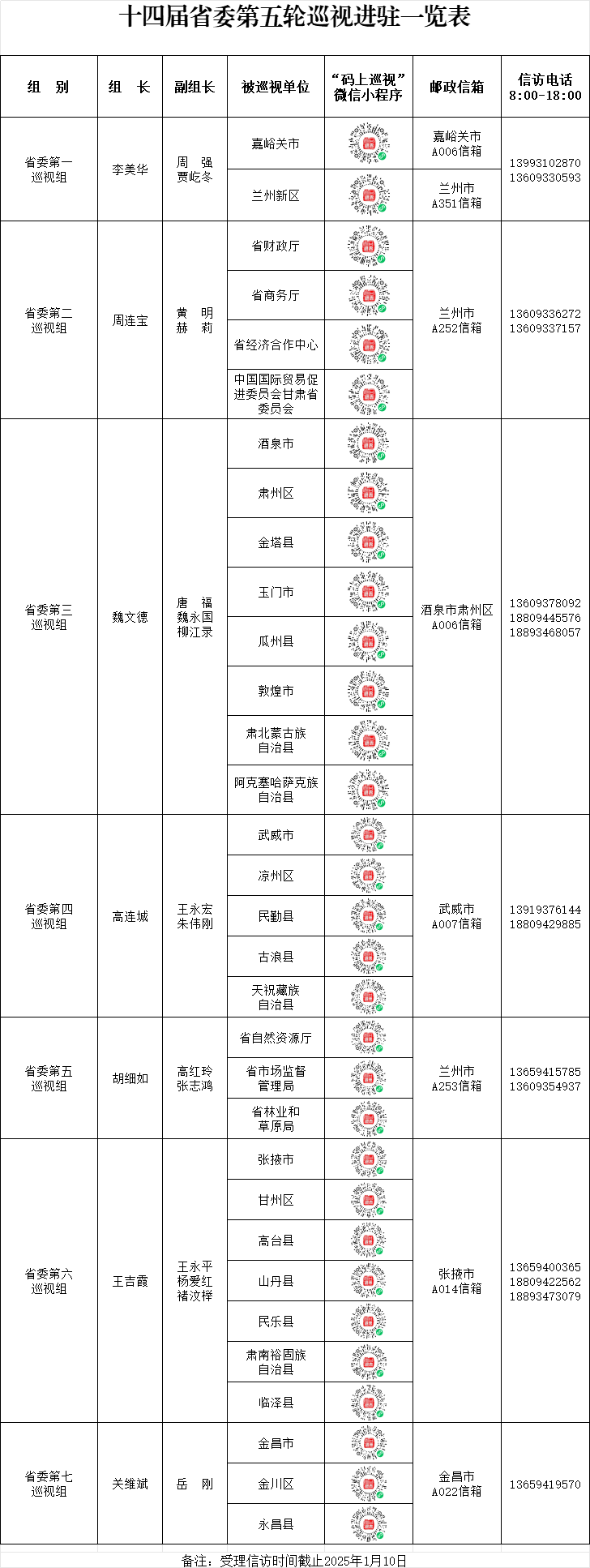 据悉,7个省委巡视组将在被巡视地区(单位)工作3个月左右,其间,设立专门信访电话、邮政信箱和联系信箱,开通“码上巡视”微信小程序,主要受理反映被巡视党组织领导班子及其成员(市县包括法院、检察院党组主要负责人)、下一级党组织领导班子主要负责人和重点岗位人员问题的来信来电来访,重点是关于违反政治纪律、组织纪律、廉洁纪律、群众纪律、工作纪律和生活纪律以及巡视整改等方面问题反映。省委各巡视组受理信访截止时间2025年1月10日。