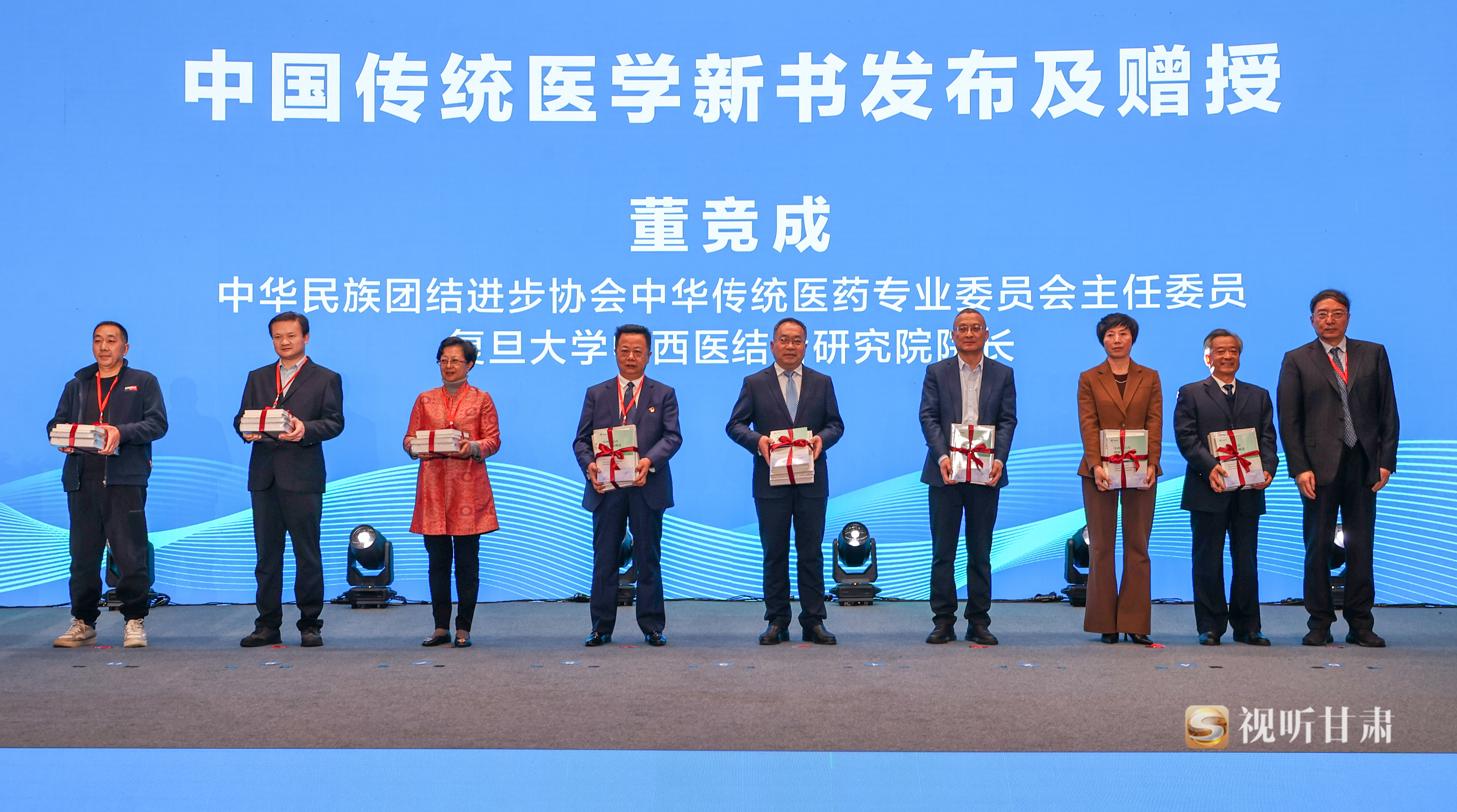 发布环节,中华民族团结进步协会中华传统医药专业委员会主任委员、复旦大学中西医结合研究院院长董竞成及团队编写的《中国传统医学比较研究》系列和《中西医结合科研方法概论》亮相盛会,并举行了简短的赠书仪式。