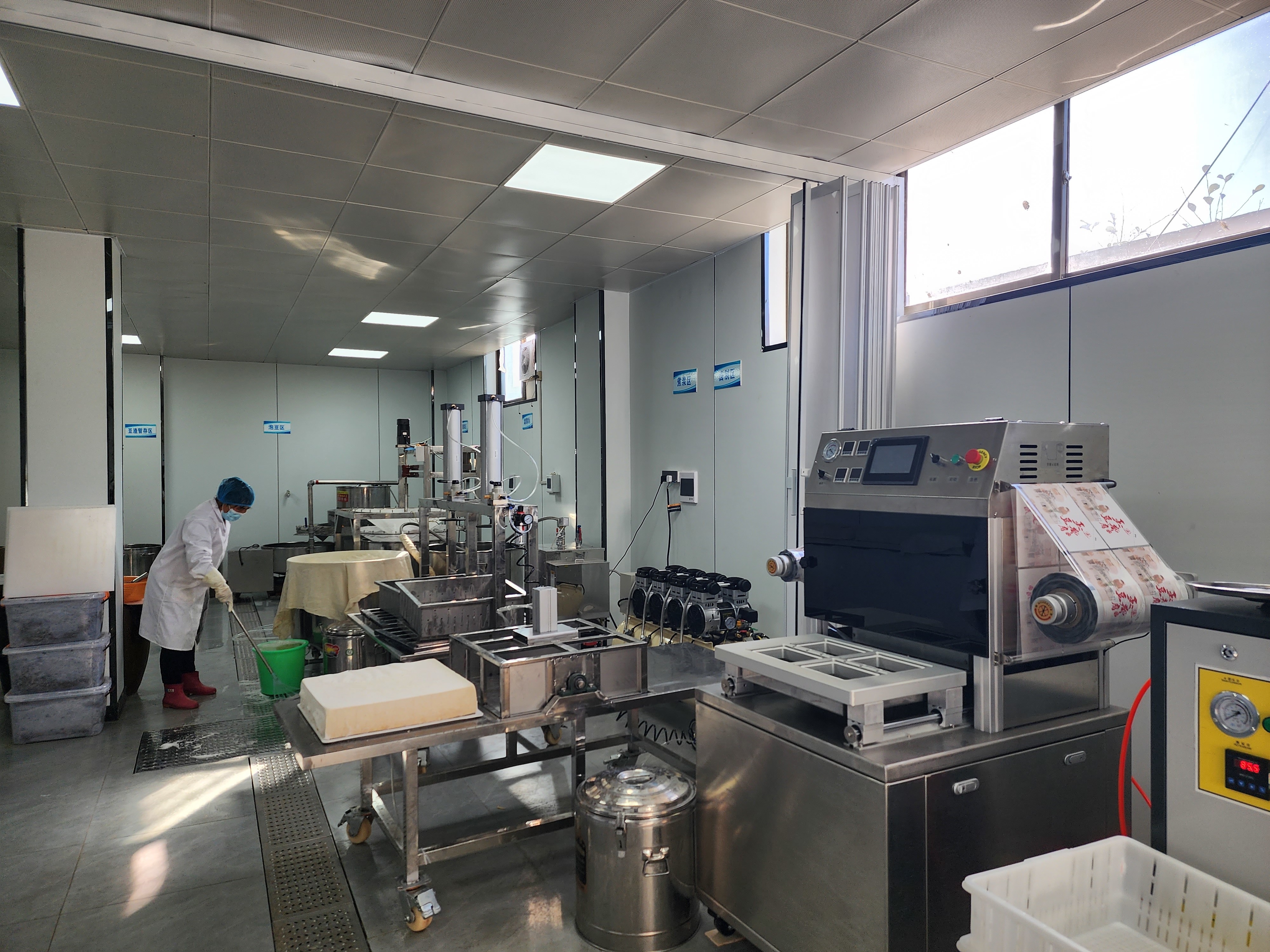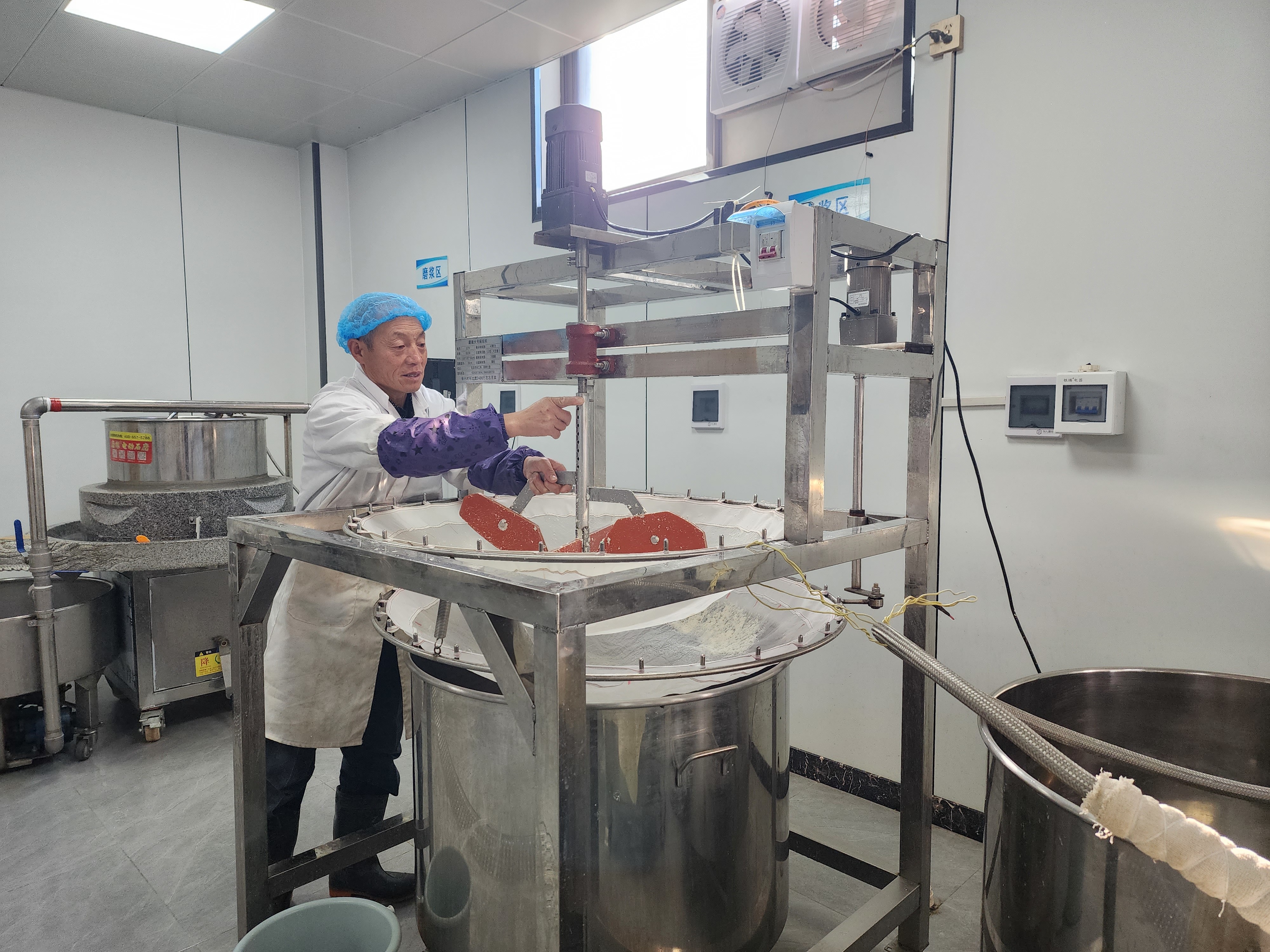 “以前,早晨五点多就得起来做前期准备工作,一天下来只能做120斤豆腐,现在做法还是和以前一样,换成机器以后制作效率提高了很多,豆腐成型用液压,而且压得实,压得好,还干净。”制作豆腐的师傅程七林说。