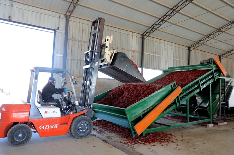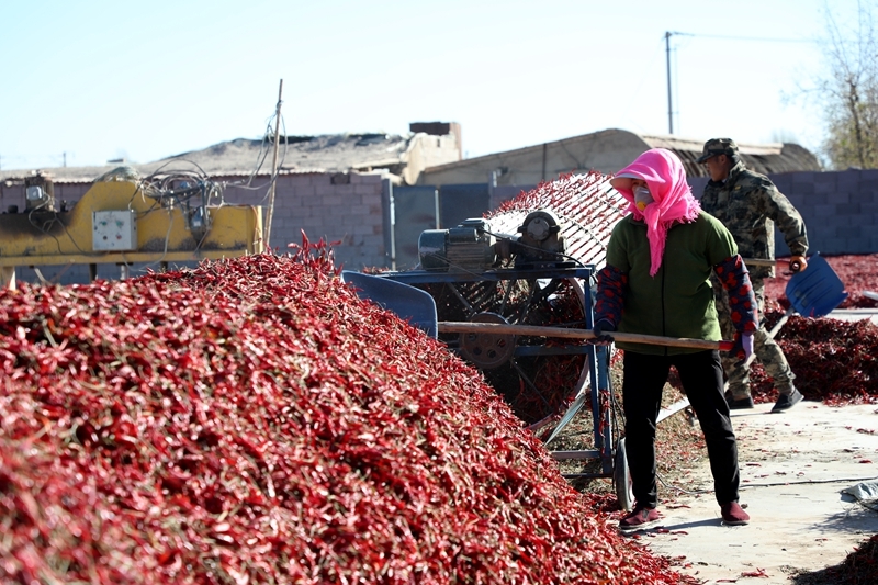 近日,走进新华镇胜利村辣椒加工厂内,堆积成垛的辣椒有序地摆放着,车间内机器轰鸣,工人们将辣椒运进加工车间,经过上料、除尘、剪把、分拣等工序,火红的辣椒被装进袋中,将按订单发往省内外市场。