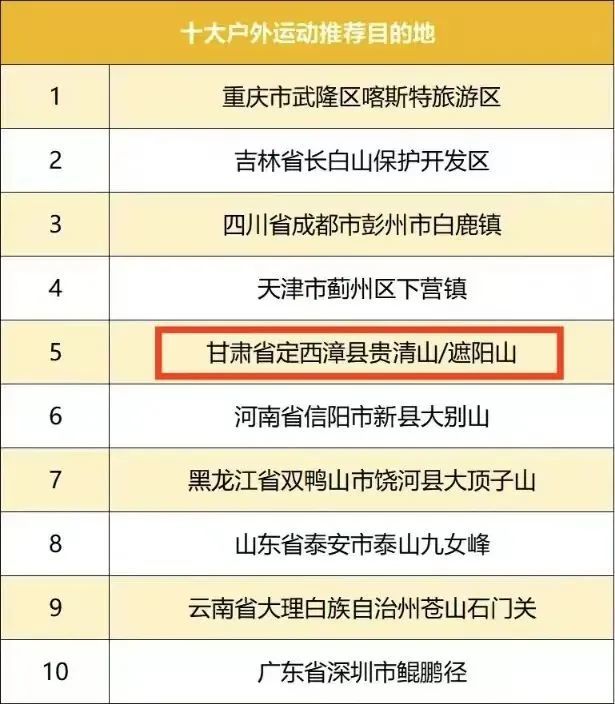 开幕式上,国家体育总局登山运动管理中心相关负责人宣读了十大户外运动推荐目的地。其中,甘肃省定西漳县贵清山/遮阳山被评选为2024年十大登山户外运动特色目的地之一。