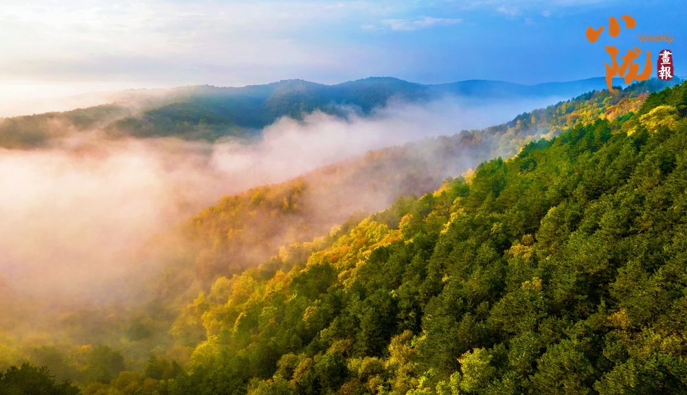 雨后日出,云遮雾盖,为子午岭披上一袭薄纱。金黄、深绿在阳光下熠熠生辉,彰显着生命的活力,形成了一片生机勃勃的天地。