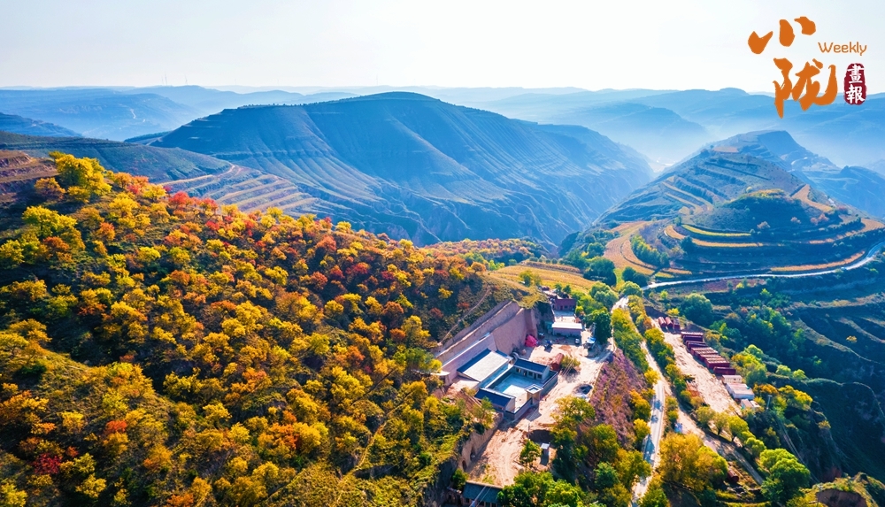 放眼望去,层林尽染,秋色与蓝天白云相互映衬,把这里的沟壑梁峁装点的五彩斑斓。