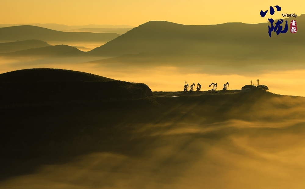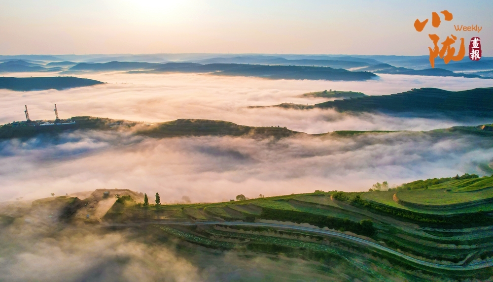 傍晚,空中泛起淡淡云雾环绕在沟壑之间,呈现出华池别样的雾海景观,远处一架架抽油机在上下舞动,“舞姿”灵动而优美。