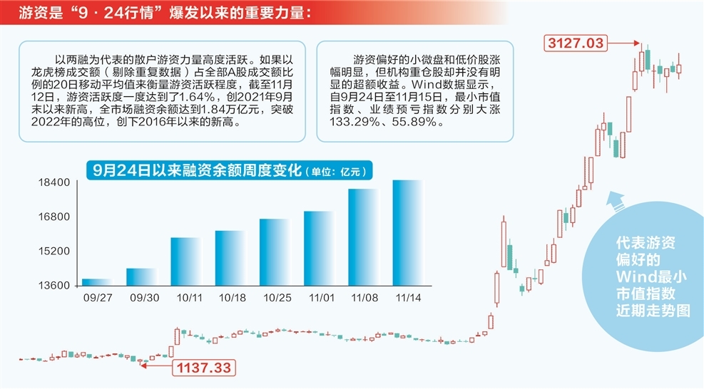 另一方面,以两融为代表的散户游资力量高度活跃。如果以龙虎榜成交额(剔除重复数据)占全部A股成交额比例的20日移动平均值来衡量游资活跃程度,截至11月12日,游资活跃度一度达到了1.64%,创2021年9月末以来新高,全市场融资余额达到1.84万亿元,突破2022年的高位,创下2016年以来的新高。